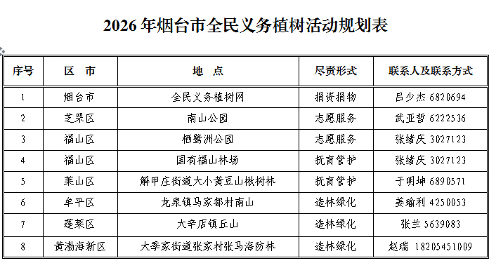 今年3月12日是我国第48个植树节,为全面组织好全民义务植树活动,烟台市林业局联合各区市林业主管部门提供18个义务植树点,广大市民朋友可咨询后就近参与植树活动。