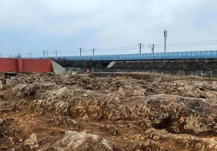 该施工现场位于宁阳县磁窑镇东磨庄村东、华丰镇歇息铺村西。记者在现场看到,这片“石海”藏身于一处大型施工坑内,坑体呈南北长条状,南北长约300米,东西宽近100米,坑的西侧紧邻高铁道路,东侧不远处便是村民房屋。