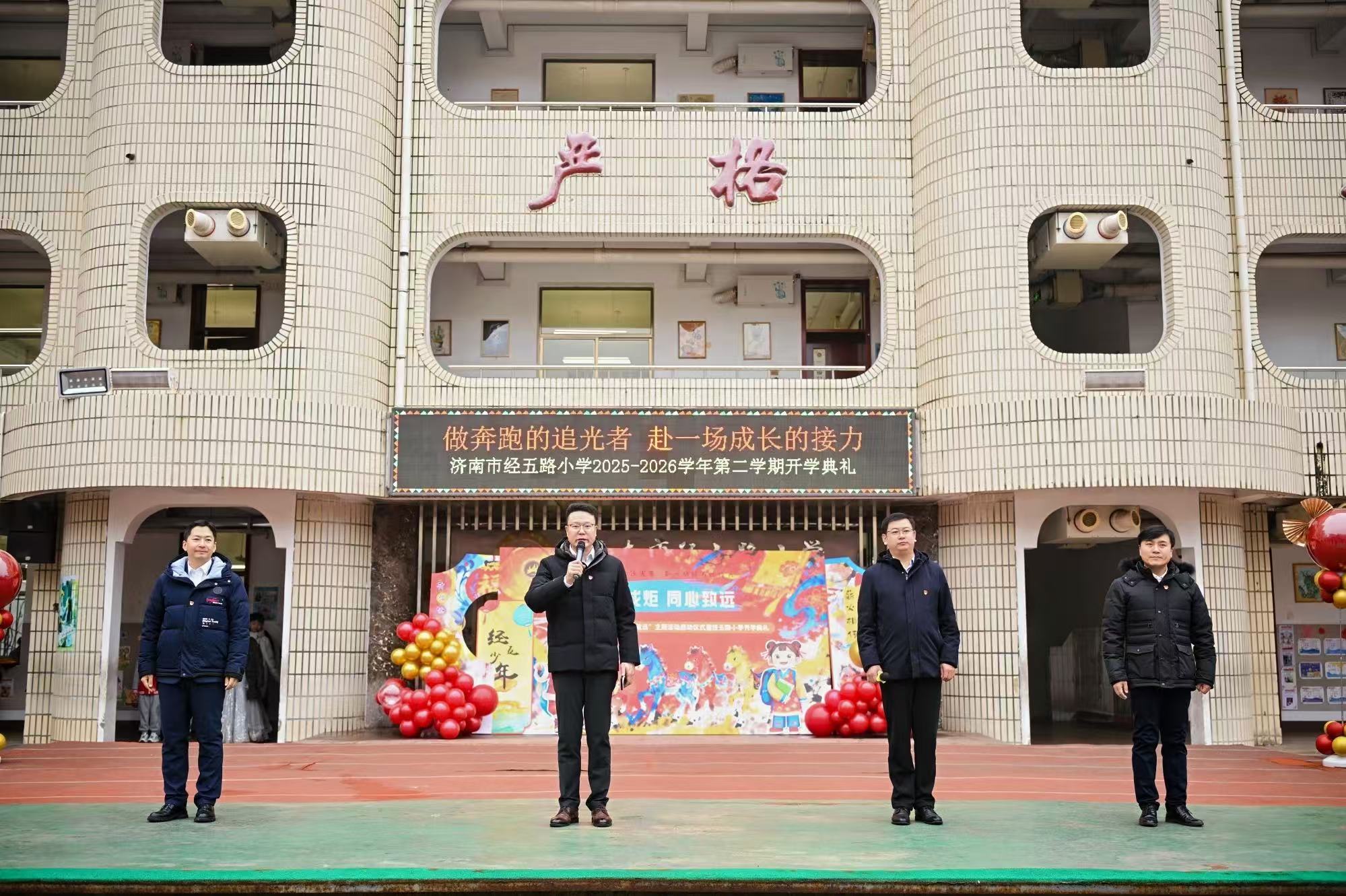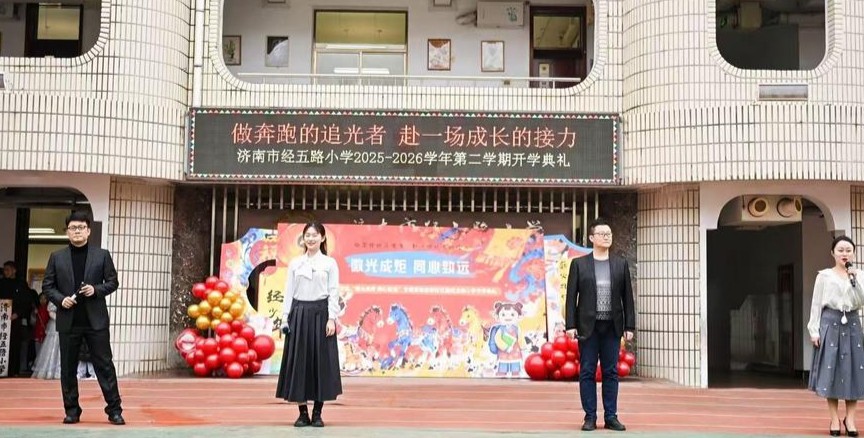 春意萌动,万物竞发。3月4日上午,济南市经五路小学以“微光成炬,同心致远”为主题举行新学期开学典礼。济南市教育局党组成员、副局长宋豫,市中区人民政府副区长王菊,济南市教育局民继处副处长、二级调研员左爱军,济南市教育局民继处副处长臧绍宇,市中区教体局党组书记、局长宫春,市中区教育教学研究中心主任明亮等出席活动,与全校师生及家长代表共同迎接新学期的到来。
