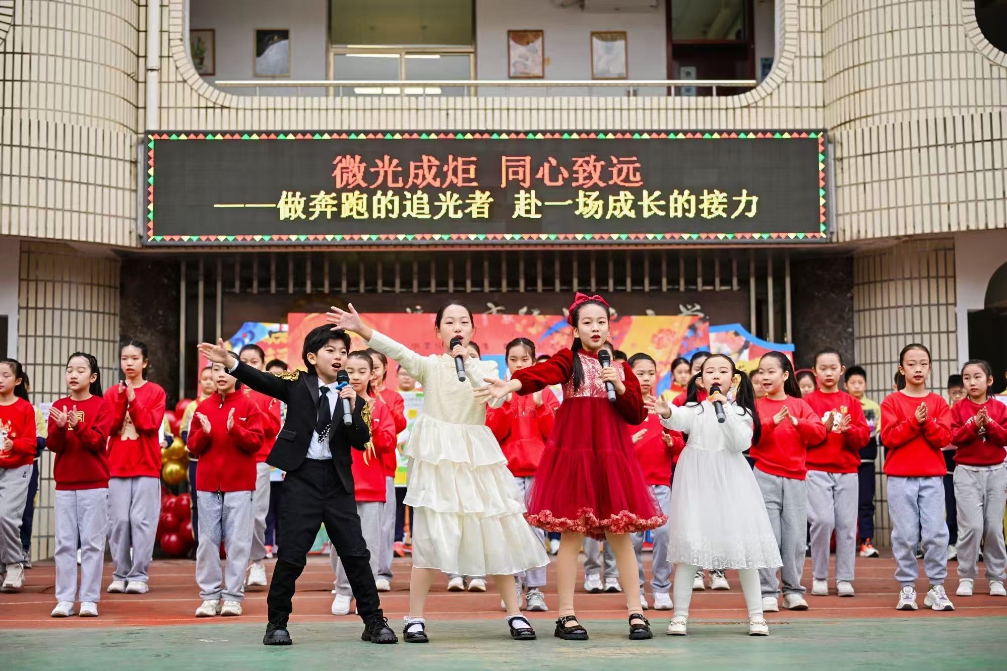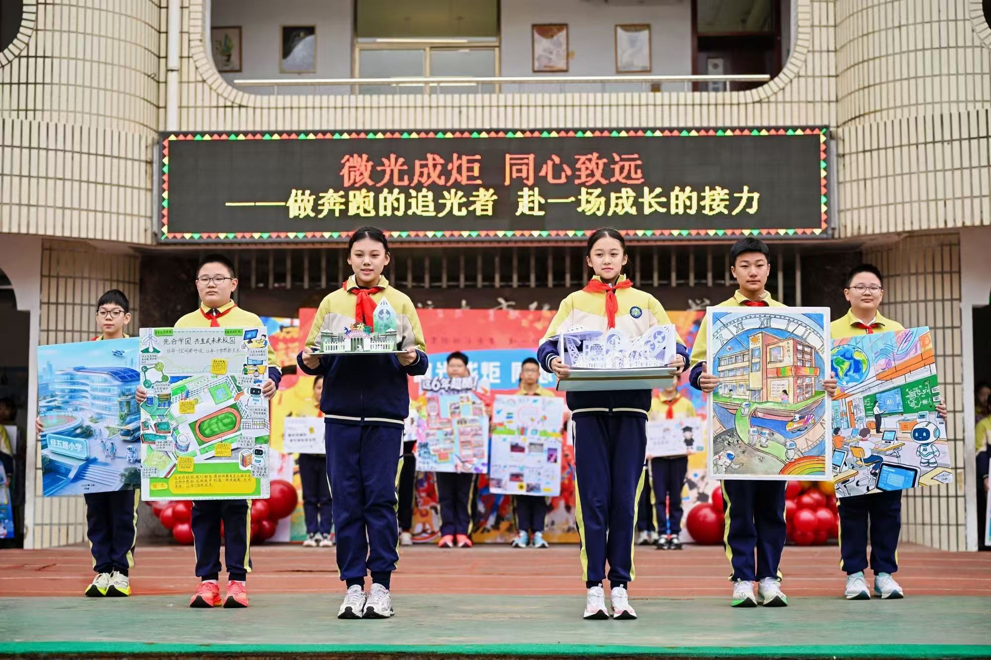 传承的最好方式是践行。“社区议事厅”情景剧展现了“红益+”志愿团队的默默奉献,“城市守护者”实践缩影让公益的星火被看见、被传递。“爸爸思政团”家长代表以“崇德向善”“正德明志”“明德惟馨”三个维度为不同年级的学生搭建美德成长阶梯。全校同学手持“美德种子班”认证牌如林挥舞,微光成炬。六年级同学带来的“未来学校蓝图”创意走秀、“天空教室”“生态循环校园”“AI智慧学习伙伴”等创意构想展示将活动推向高潮。孩子们不再是知识的被动接受者,而是未来学校的共创者。伴随着五彩气球腾空而起,孩子们的梦想也随之飞向广阔天空。