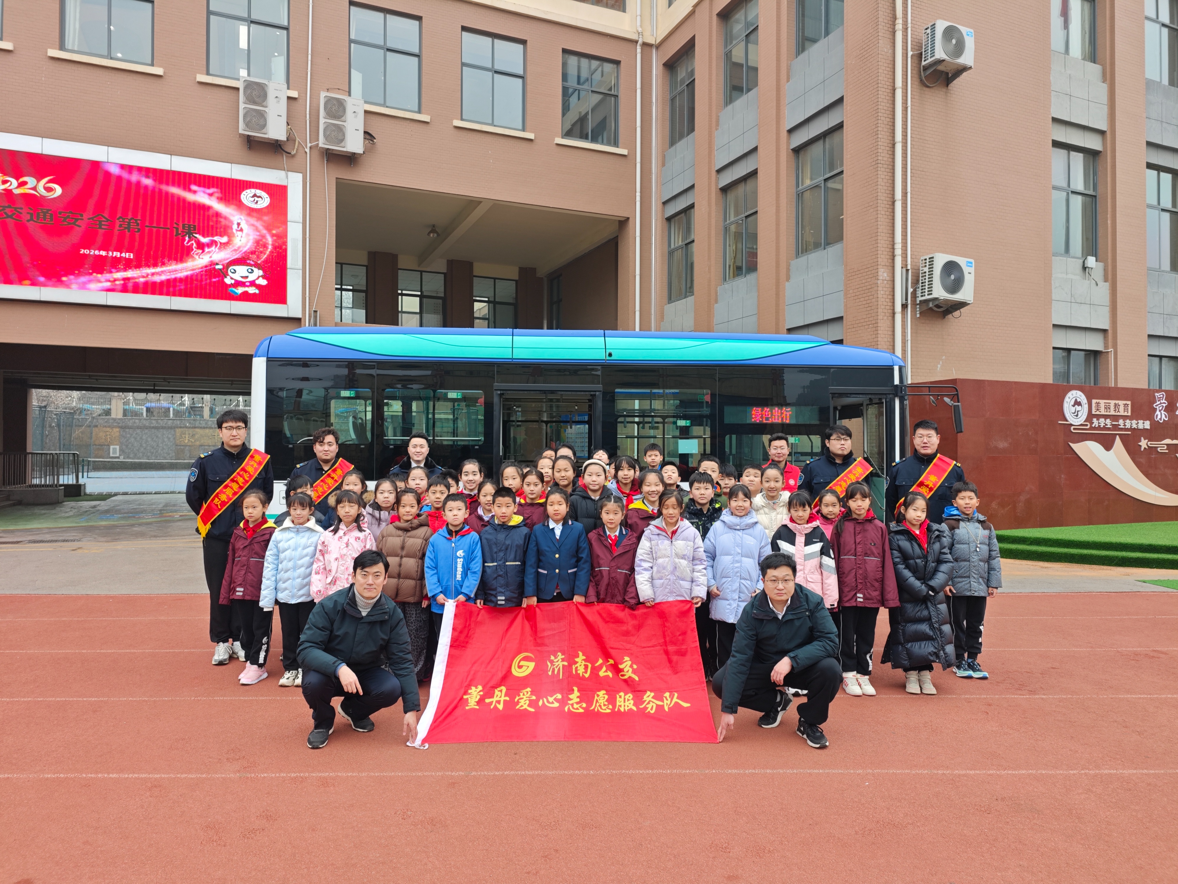 开学季启新程,安全行伴成长。3月4日上午,济南公交中部分公司一队B52路雷锋精神主题线路、董丹爱心志愿服务队,走进济南市景山小学,开展“春风送学,安全随行”开学安全课堂活动,为师生们送上一堂生动实用的交通安全课,筑牢校园出行安全防线。本次活动邀请到山东省劳动模范董丹、济南市“五一劳动奖章”获得者邢如飞,与B52路驾驶员代表一同,为景山小学师生代表带来专业的安全知识讲解。