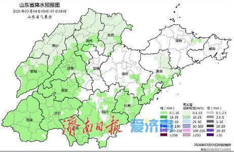 从山东全省天气预报来看,4日下午到5日白天,鲁西北和北部沿海地区天气阴有小雨雪转多云,其他地区天气多云转阴局部有小雨,鲁西北地区有雾或轻雾。南风转北风3~4级。最低气温:半岛地区-2℃左右,聊城和鲁南地区4℃左右,其他地区1℃左右。5日最高气温:聊城和鲁南地区11℃左右,鲁中山区和半岛地区5℃左右,其他地区8℃左右。