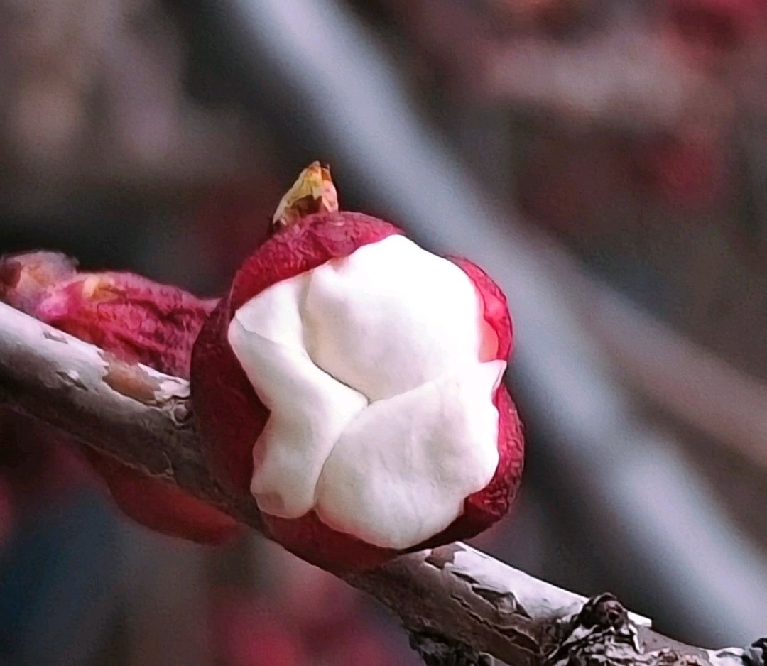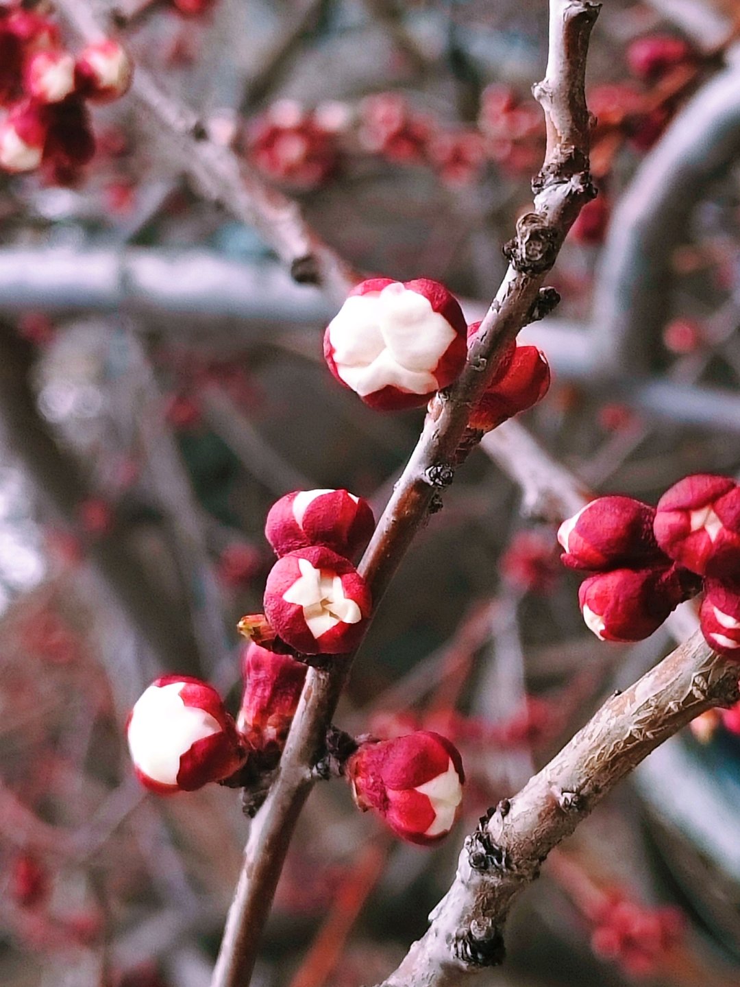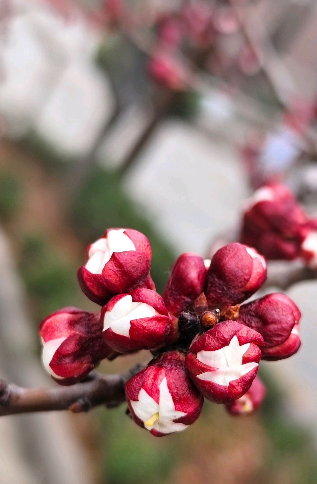 一簇簇紧裹的嫣红,映衬着顶端已然探出头来的莹白,静美的画面格外令人心动:恰是寒冬褪去后的温柔回响,更是春天写给大地的情书,预示着即将到来的满园芬芳。