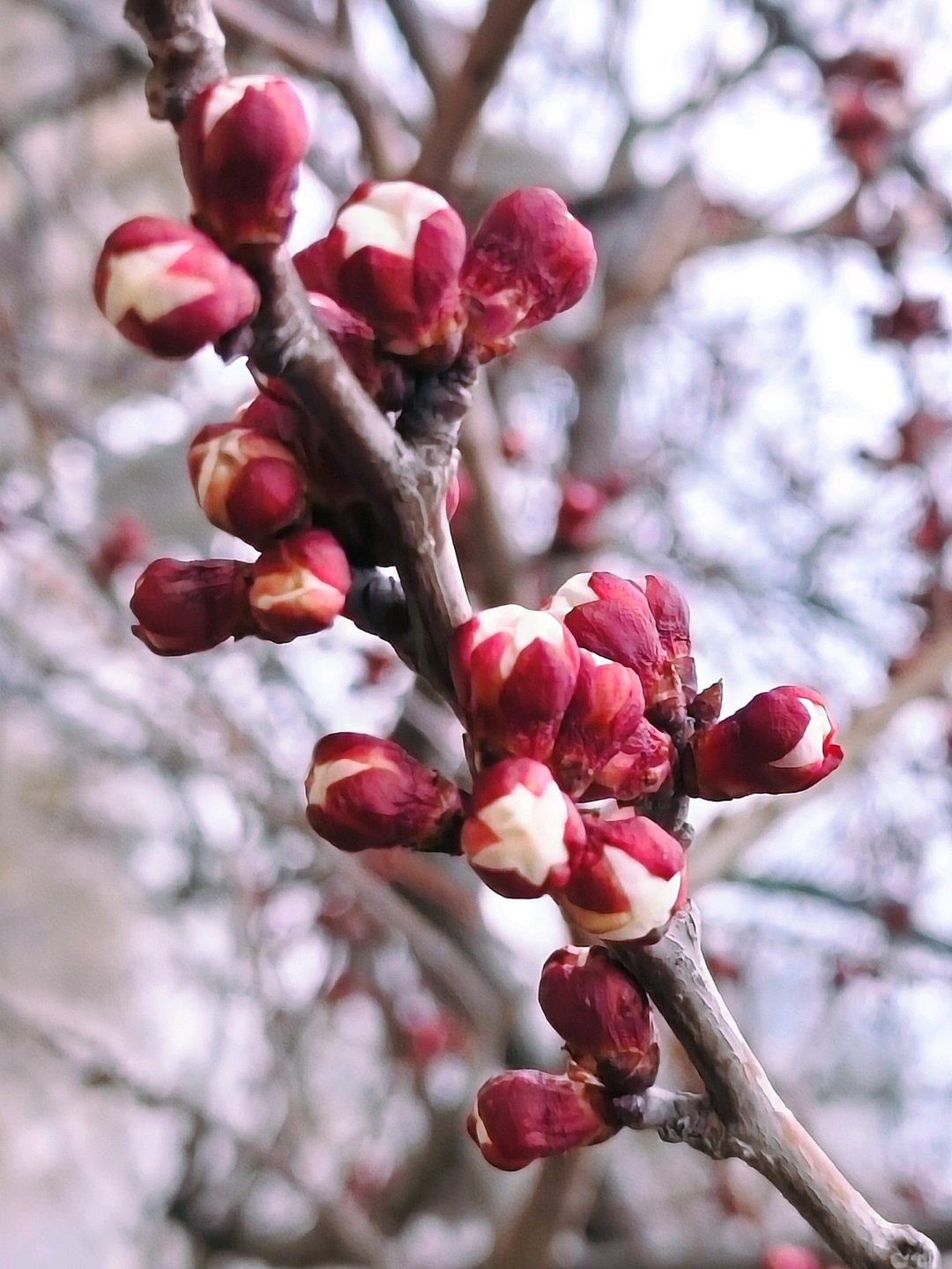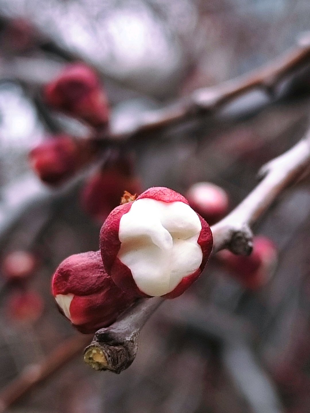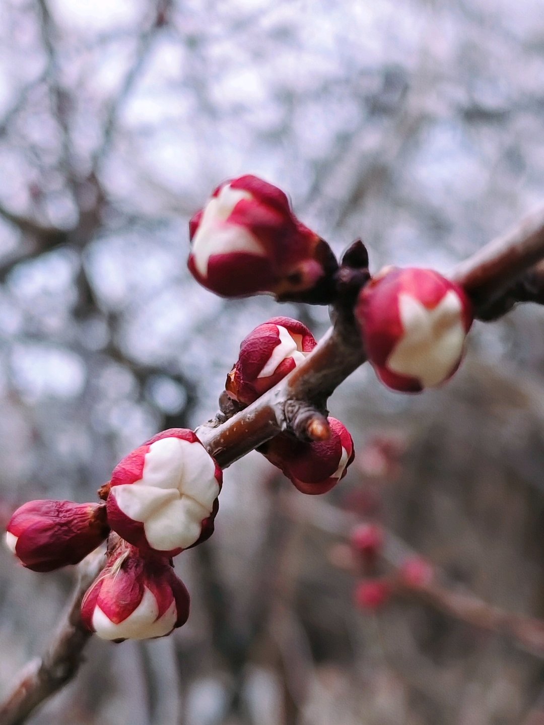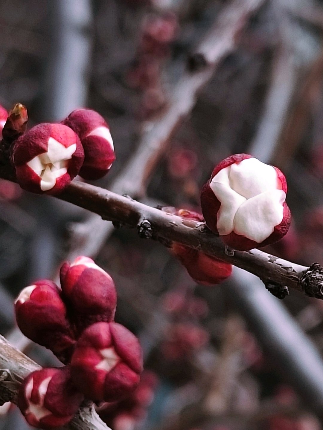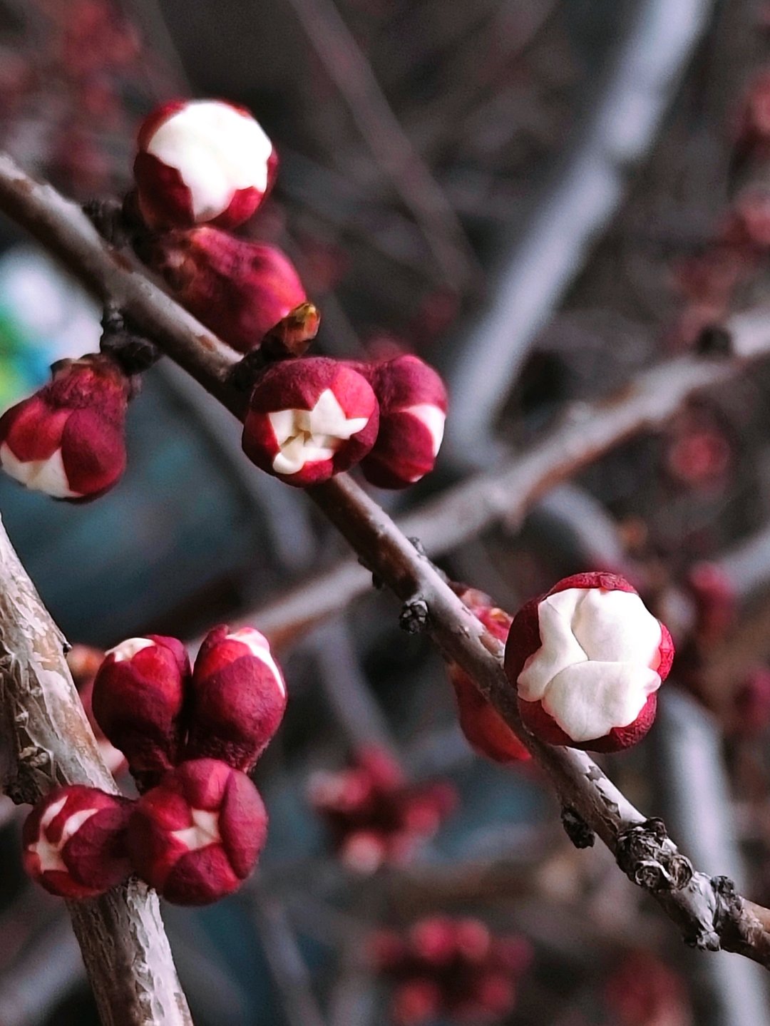 红萼初绽,却并不急于盛开。此刻它们正在寒风中积蓄力量,默默把春意装进花苞,酝酿关于盛开的一场梦:待到春风起时,定能惊艳枝头。