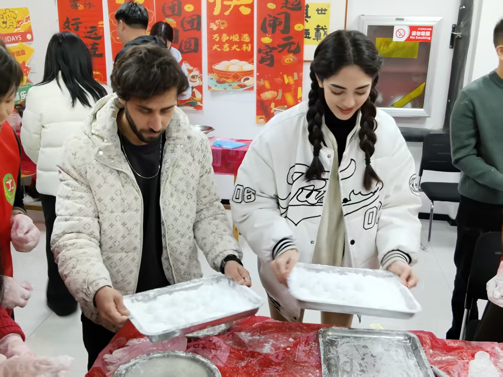 本次活动是胶州市“走近上合”文明互鉴系列活动之一,由中国—上海合作组织经贸学院、胶州市文明办联合主办,中云街道办事处承办,旨在弘扬中国传统文化,搭建中外文化交流桥梁。活动现场暖意融融,元宵节主题民俗漫画展上,一幅幅生动鲜活的漫画展现了元宵节的由来、当地元宵节传统习俗及相关民俗故事,吸引留学生们驻足观看。随后,外籍留学生们围聚在社区文明实践志愿者身旁,兴致勃勃地做起元宵,手把手学习搓粉、团馅、滚圆,生疏的手法藏不住高涨的兴致,欢声笑语中,一颗颗圆润的元宵成形,外籍留学生们也就随着大伙“闹”起元宵来。