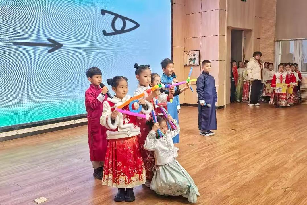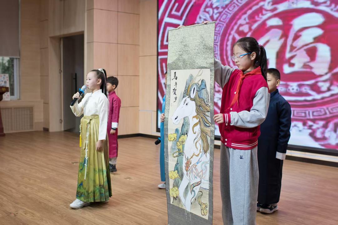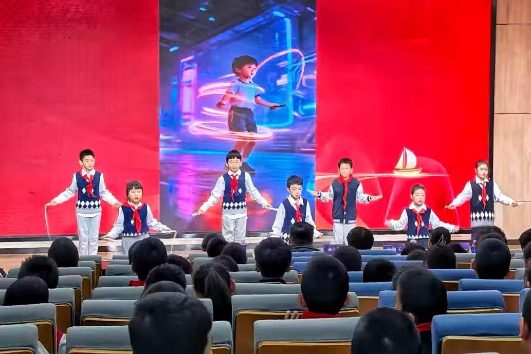 同学们将寒假五美实践收获化作舞台展示:低年级《马踏春归》创意秀传承生肖文化;中高年级分享《沐德创美,拾趣假期》成长故事;12名运动小达人进行一分钟跳绳展演。