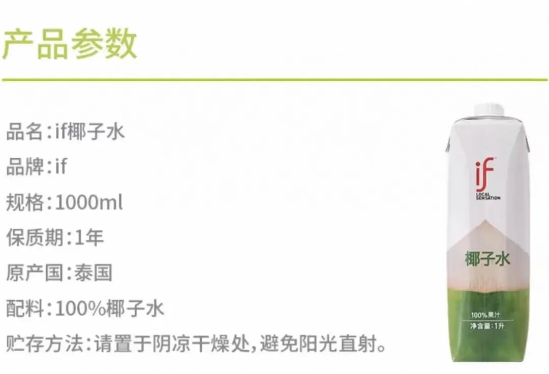 有意思报告查询if官方旗舰店发现,其1L装椰子水售价为14.2元。在商品详情页上,配料表也只写有“100%椰子水”。