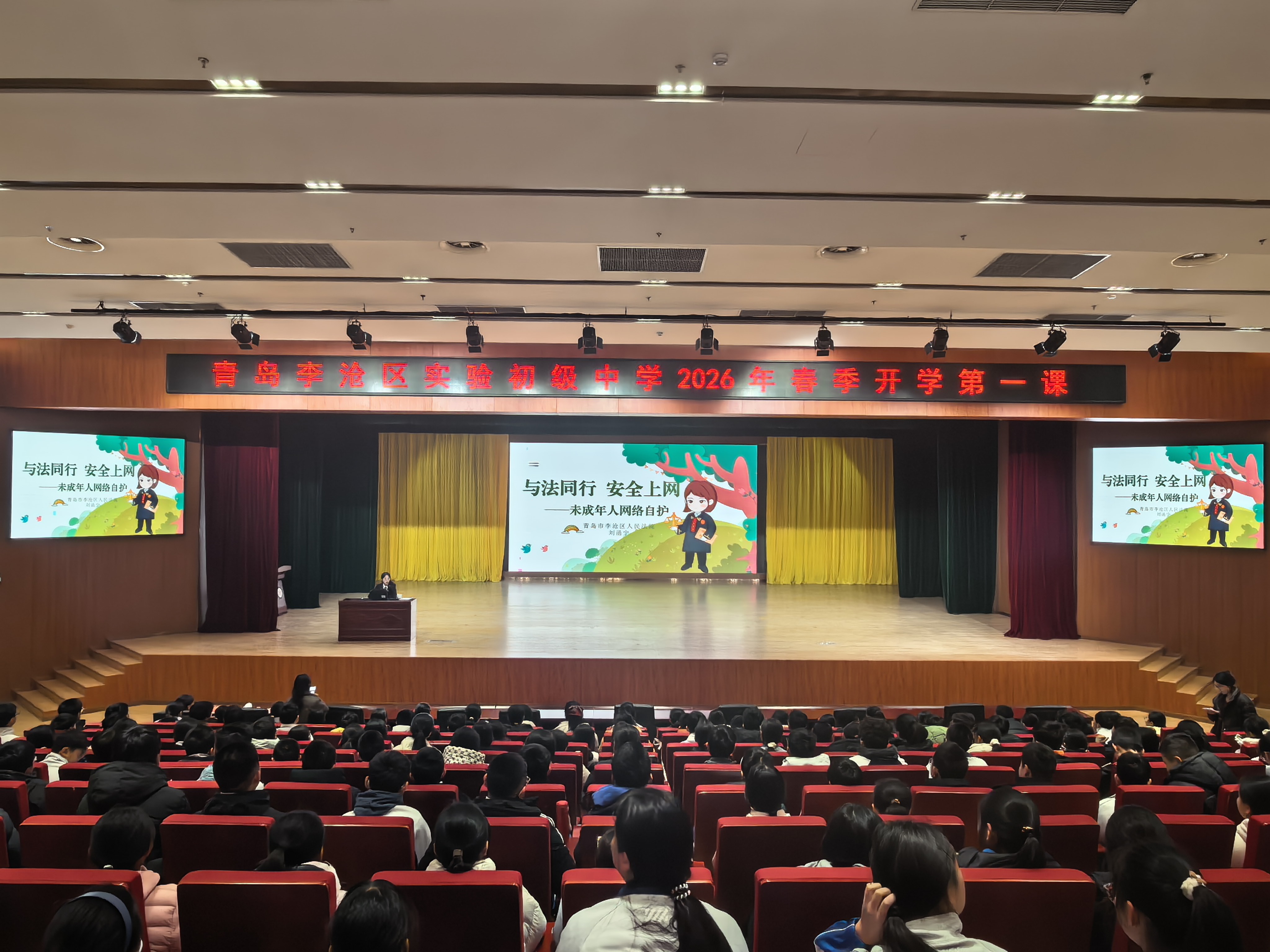 为加强青少年网络安全防范意识与法治素养,筑牢安全防线,3月4日,根据青岛市李沧区委政法委安排部署,李沧法院、李沧区教体局走进青岛实验初中李沧分校,以“与法同行,安全上网”为主题,为全校师生送上干货满满、生动实用的开学第一课。