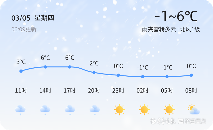 今天是2026年3月5日,星期四,农历正月十七,德州迎来惊蛰节气。今日天气为雨夹雪转多云,温度在-1℃到6℃之间,北风1级,空气湿度98%。PM2.5浓度为126,属于轻度污染,建议市民外出时佩戴口罩,减少长时间户外活动。惊蛰标志着春雷开始,万物复苏,市民可适当调整作息,注意防寒保暖。随着气温逐渐回升,市民需关注天气变化,合理安排出行计划。预计未来三天,德州气温波动较大,最高气温可达9℃,最低气温为-3℃。明后两天早晨可能出现大雾,局地能见度较低,建议市民出行时减速慢行,注意交通安全。此外,降雨天气可能导致道路湿滑,司机朋友需保持车距,确保行车安全。温馨提示