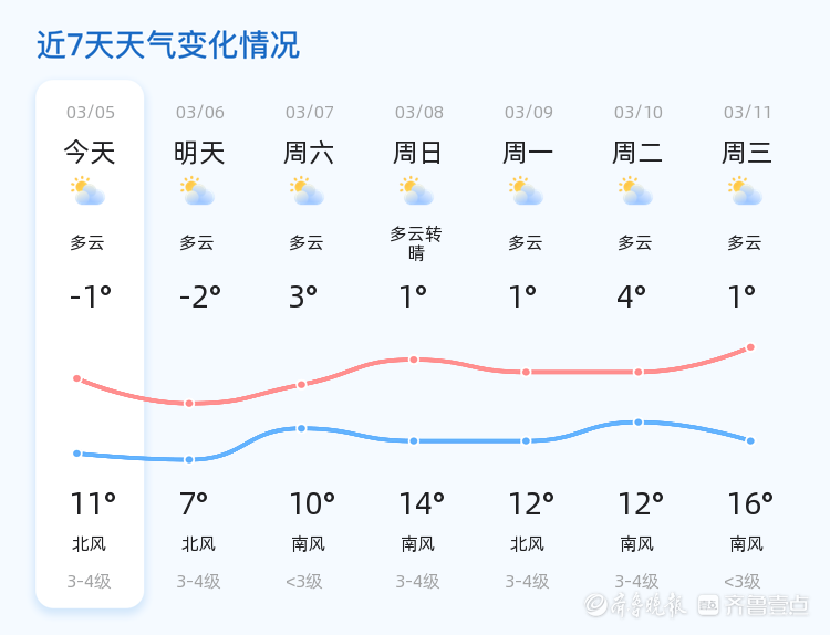 明天3月6日,聊城仍为多云天气,但气温略有下降,最低气温-2℃,最高气温7℃,北风3-4级。与今天相比,明天气温较低,市民需注意保暖。