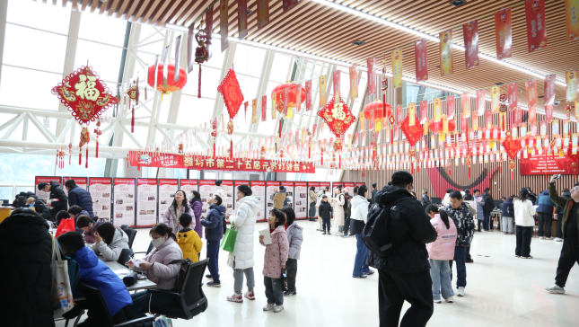 元宵节当天,潍坊市图书馆大厅悬挂千余条谜条,谜面特别精选了潍坊文化知识大赛相关内容,涵盖国学经典、民俗常识,并深度融合潍坊城市精神、历史文化名人、风景名胜、特色物产、城市名片等本土元素。市民现场竞猜,凭谜底兑换文创小礼品,馆内灯笼装点,将节日氛围推向高潮。市本级超然书房作为分会场同步开展活动,方便市民就近参与。
