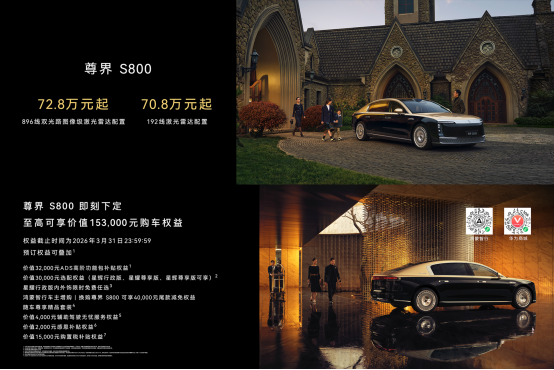 搭载新一代激光雷达的尊界S800,已于2026年3月4日开启预定,建议零售价72.8万元起,即刻下定,至高可享价值153,000元购车权益,权益截止时间为2026年3月31日23:59:59。