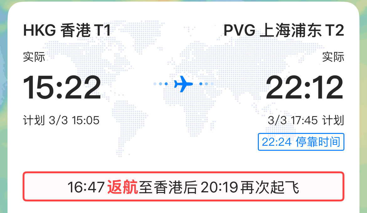 记者在飞常准app上看到,3月3日CX380次航班于15:22从香港出发,计划17:45抵达上海,但是16:47分返航至香港,20:19再次起飞,最终22:12停靠上海浦东机场。