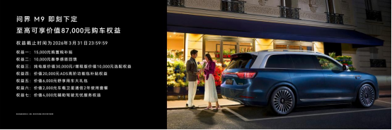 为回应消费者期待,问界M9特别推出限时购车权益,即日起至3月31日下定至高立享价值87000元购车权益,包含价值20000元 ADS 高阶功能包补贴、价值15000元购置税补贴、纯电版价值30000元/增程版价值10000元选配权益、价值6000元舒享用车大礼包、价值4000元辅助驾驶无忧服务权益等。