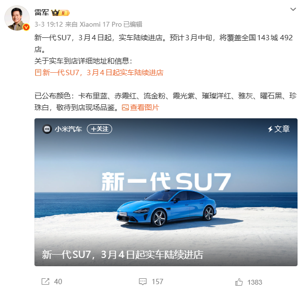 近日,小米创办人,董事长兼CEO雷军在其微博账号发文称,新一代SU7,3月4日起,实车陆续进店。预计3月中旬,将覆盖全国143城492店。