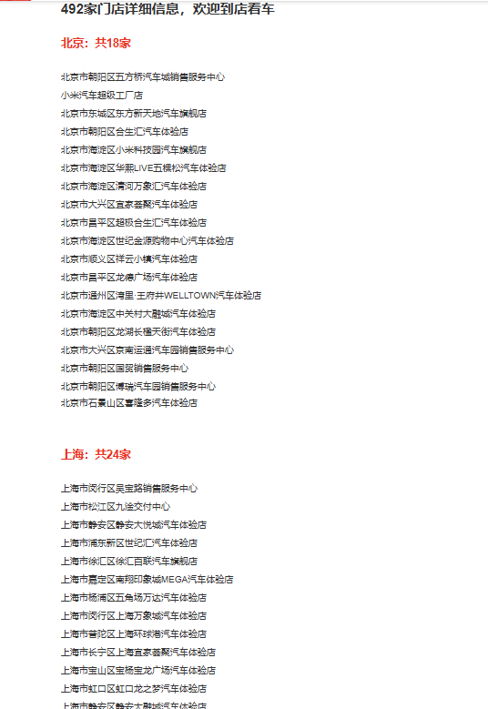 小米汽车官方微博也发文晒出具体的城市和门店地址。