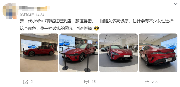 3月4日,有网友晒出新小米SU7的照片并称:颜值暴击,一眼陷入高级感。