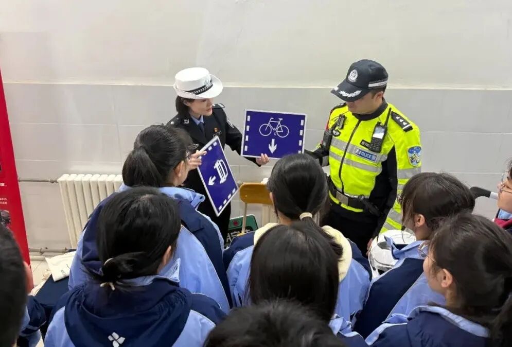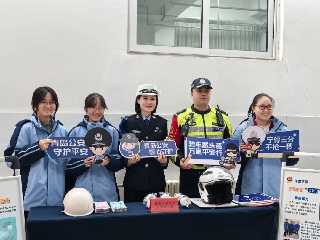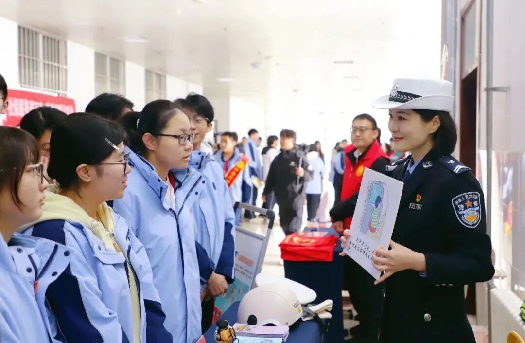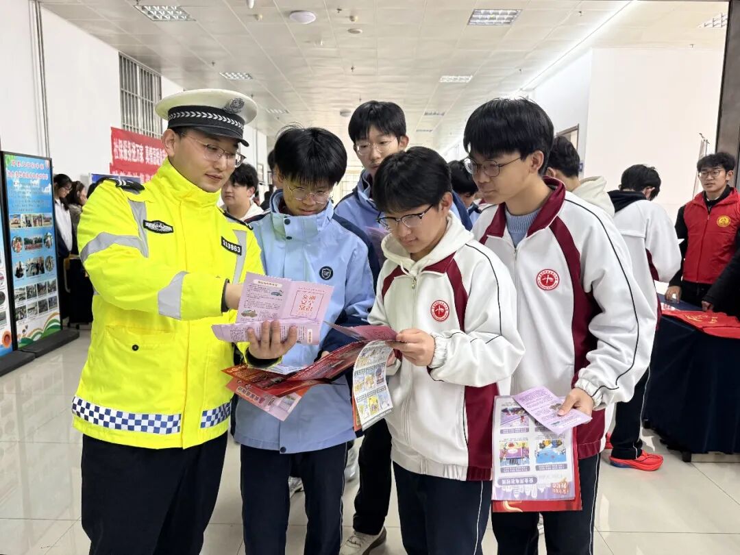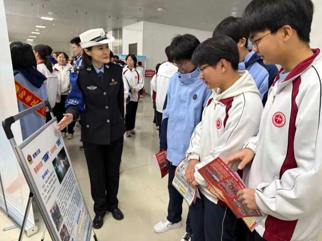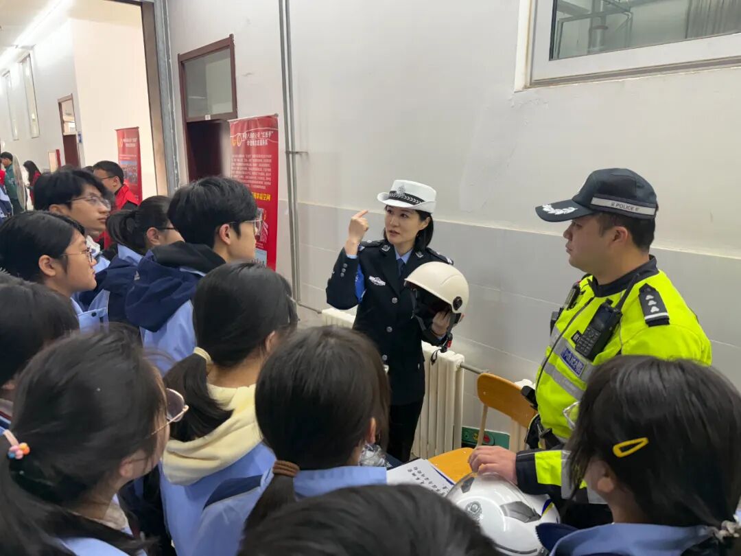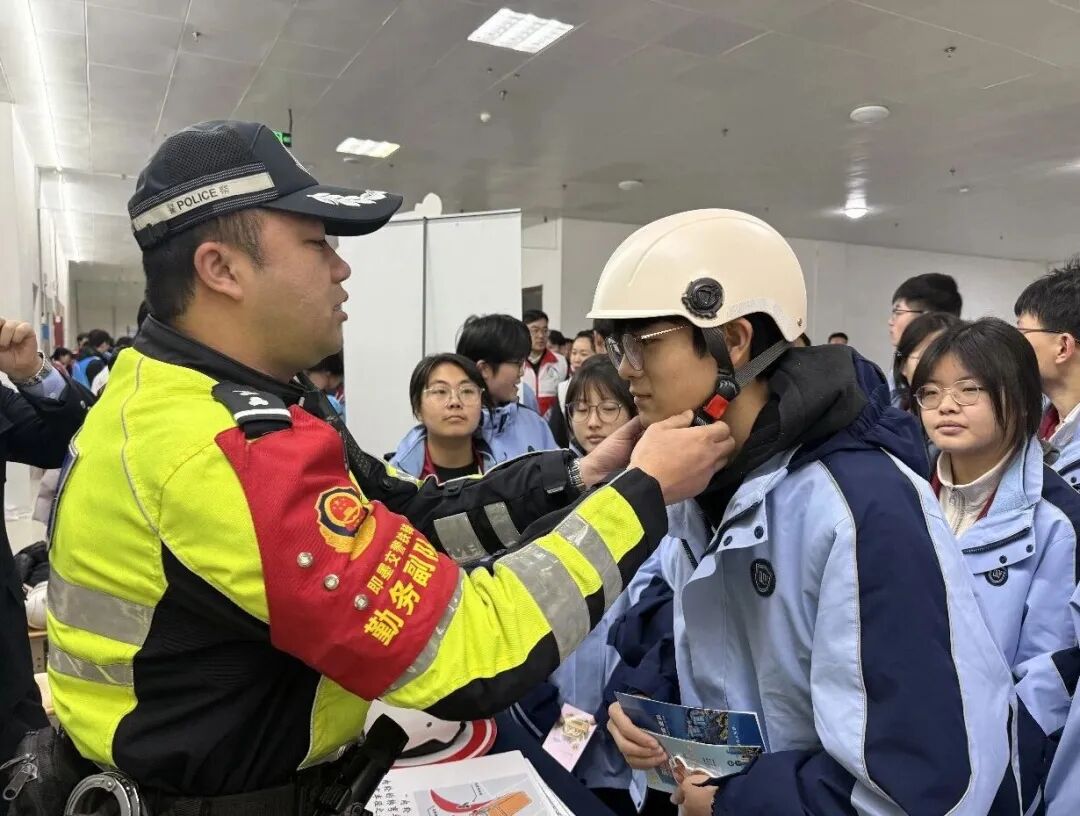 在交通安全主题宣传活动现场,民警通过设置宣传展板、现场讲解等形式,向同学们普及“一盔一带”安全常识,强调驾乘摩托车、电动车佩戴安全头盔,汽车驾乘人员正确使用安全带的重要性,引导养成良好的出行习惯。