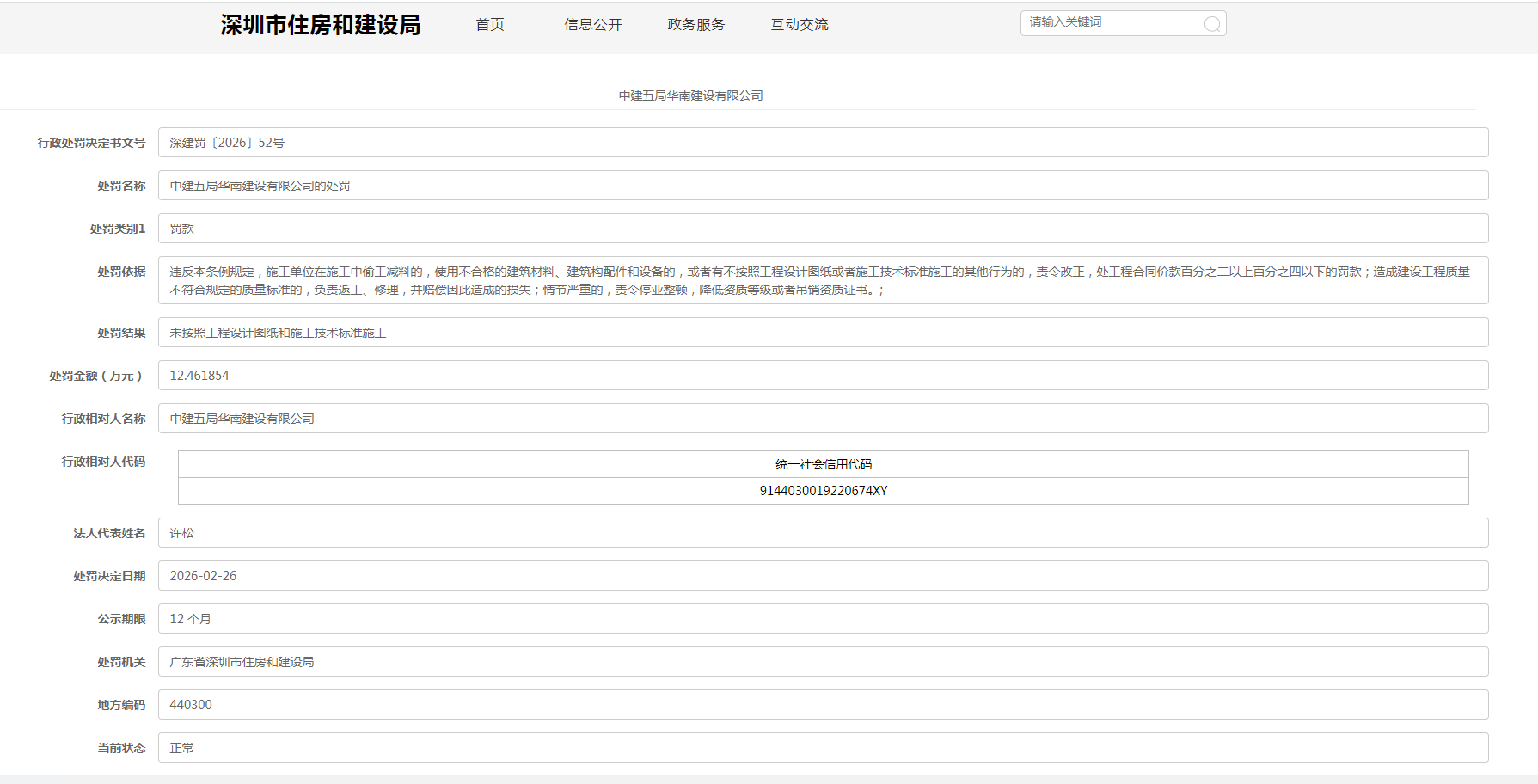 日前,深圳市住房和建设局公示了中建五局华南建设有限公司的行政处罚决定。行政处罚决定书文号深建罚〔2026〕52号显示,中建五局华南建设有限公司未按照工程设计图纸和施工技术标准施工。依据相关规定,广东省深圳市住房和建设局对其作出罚款12.461854万元处罚。