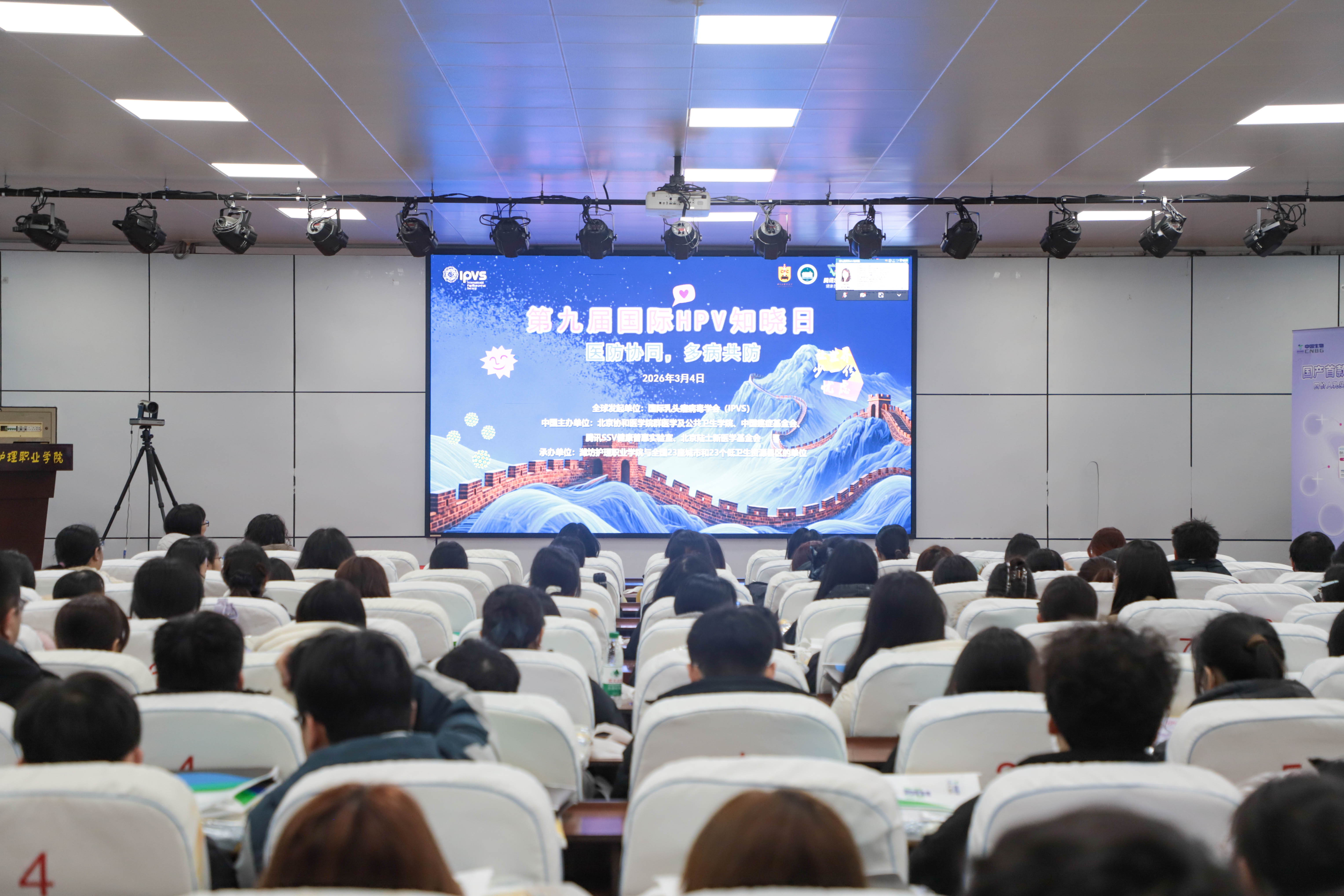 本届活动延续“主会场连线+分会场联动”模式,设置北京主会场、潍坊护理职业学院分会场。活动伊始,潍坊分会场与北京主会场及全国各分会场完成视频连线,同步接轨全球宫颈癌防控最新理念与部署,实现优质防控资源的跨区域共享与交流。