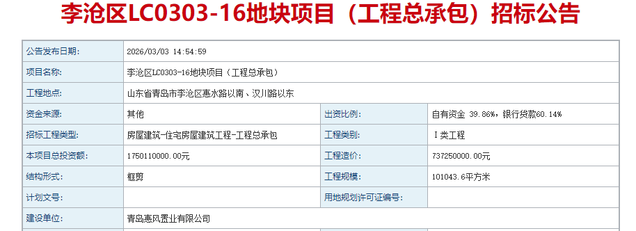 近日,李沧区LC0303-16地块项目(工程总承包)招标公告发布,工程地点位于青岛市李沧区惠水路以南、汉川路以东,总投资约17.5亿元,建设单位为青岛惠风置业有限公司。