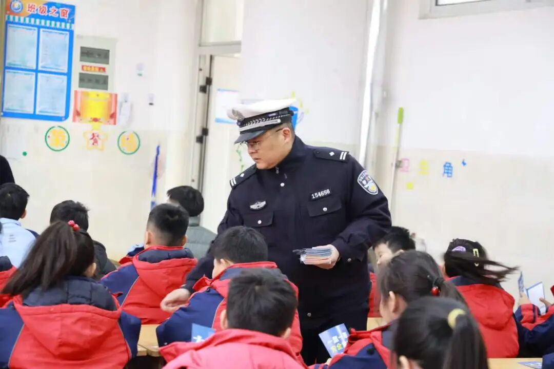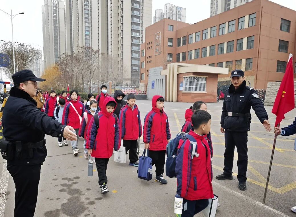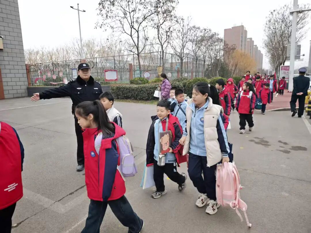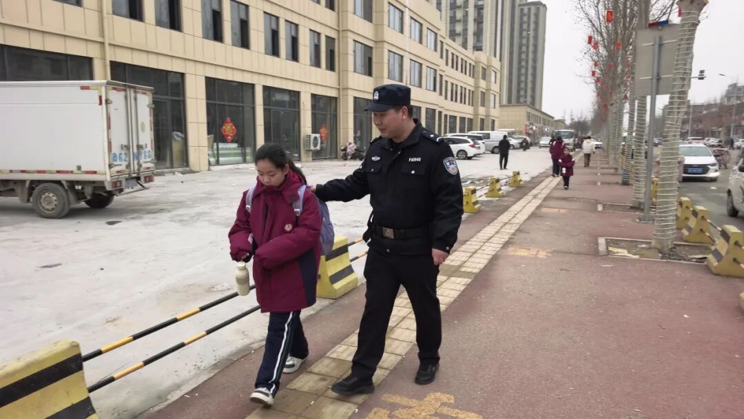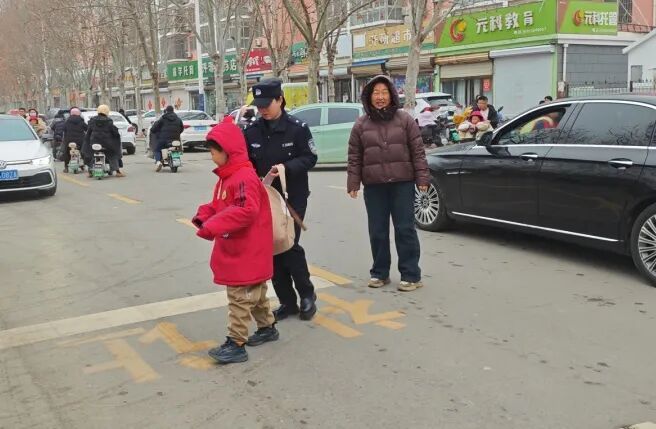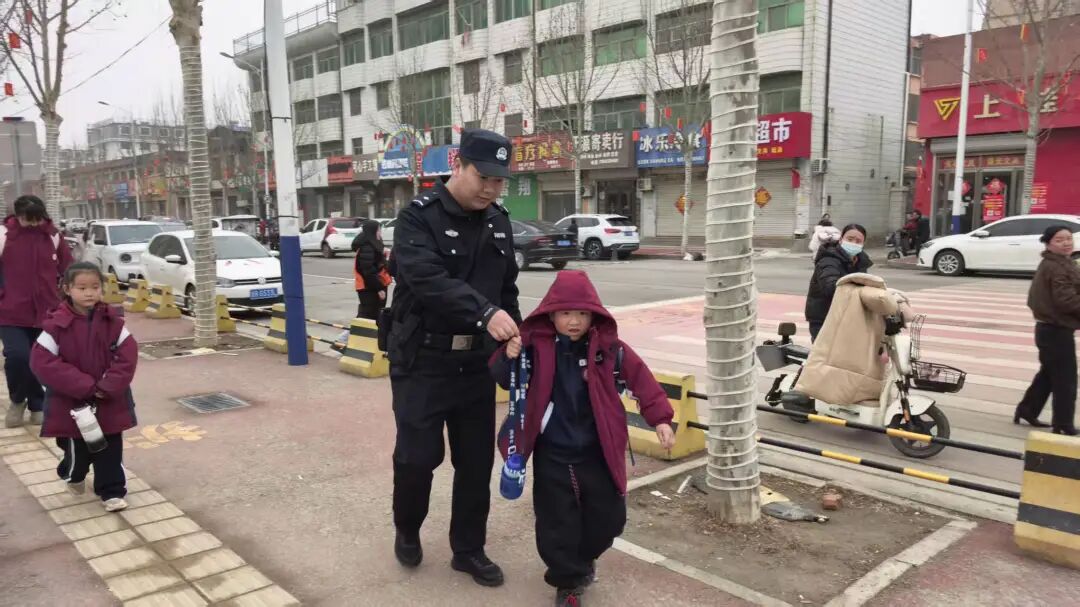 在做好秩序维护与安全守护的同时,主动为有需要的师生和家长提供帮助,引导学生有序排队进入校园,向学生及家长普及安全小知识,用点滴行动传递藏蓝温情,成为校门口最温暖的“守护屏障”。