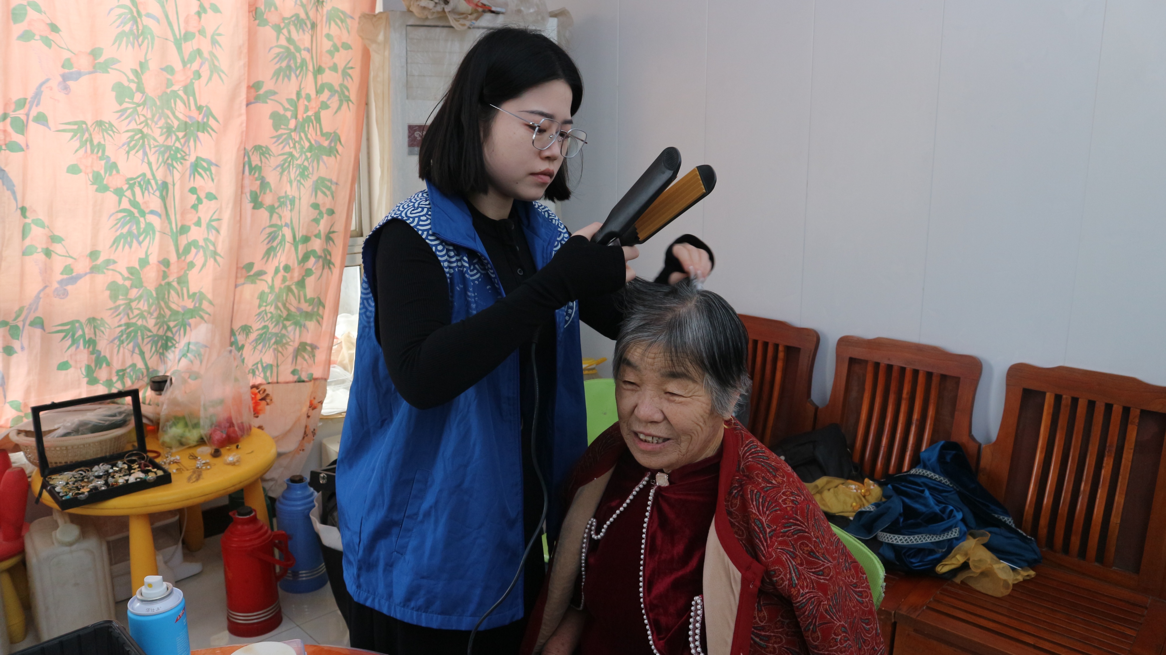 青年志愿者给王桂珍做发型。