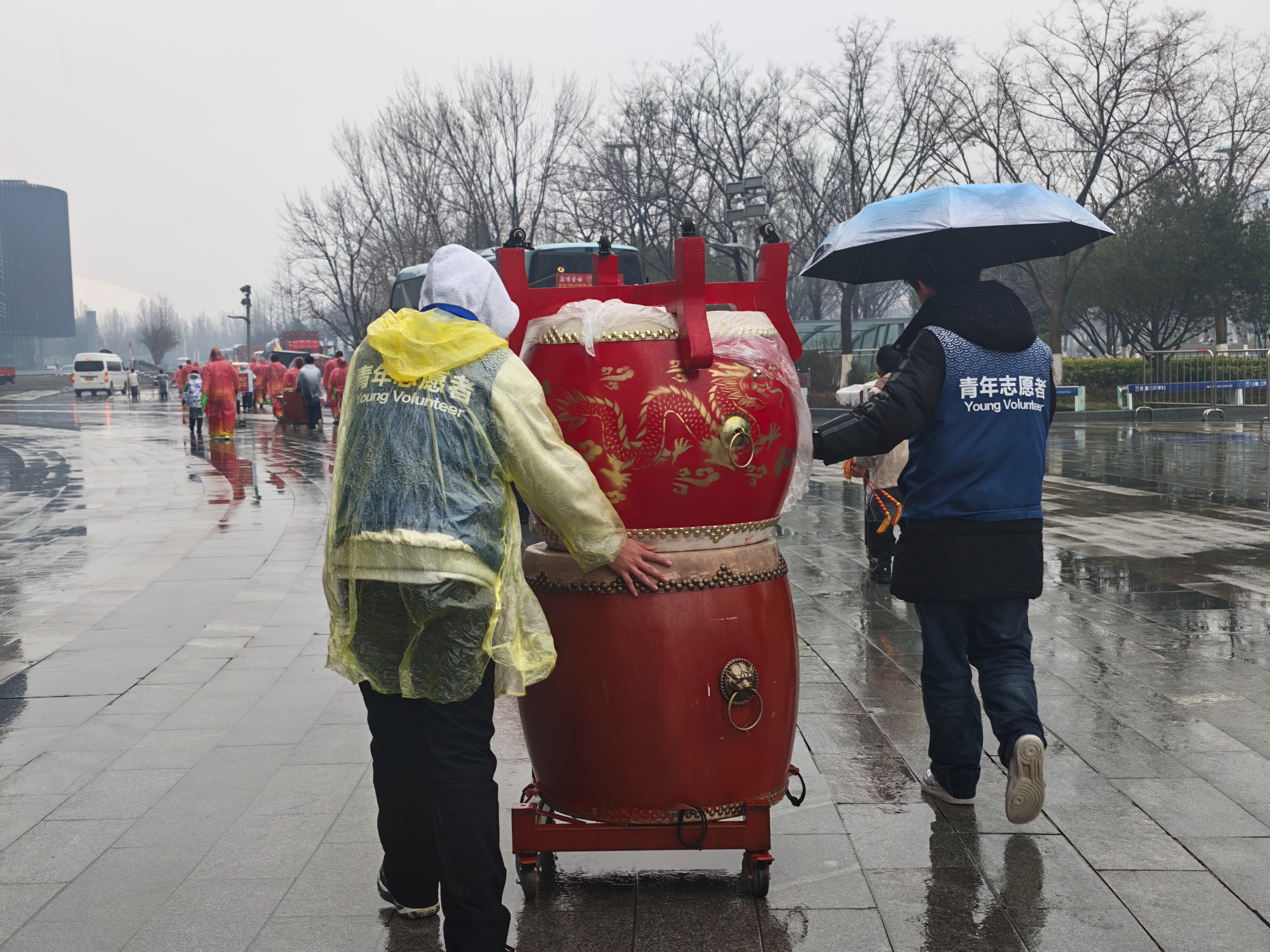 在张店民俗扮玩活动中青年志愿者帮忙运鼓。