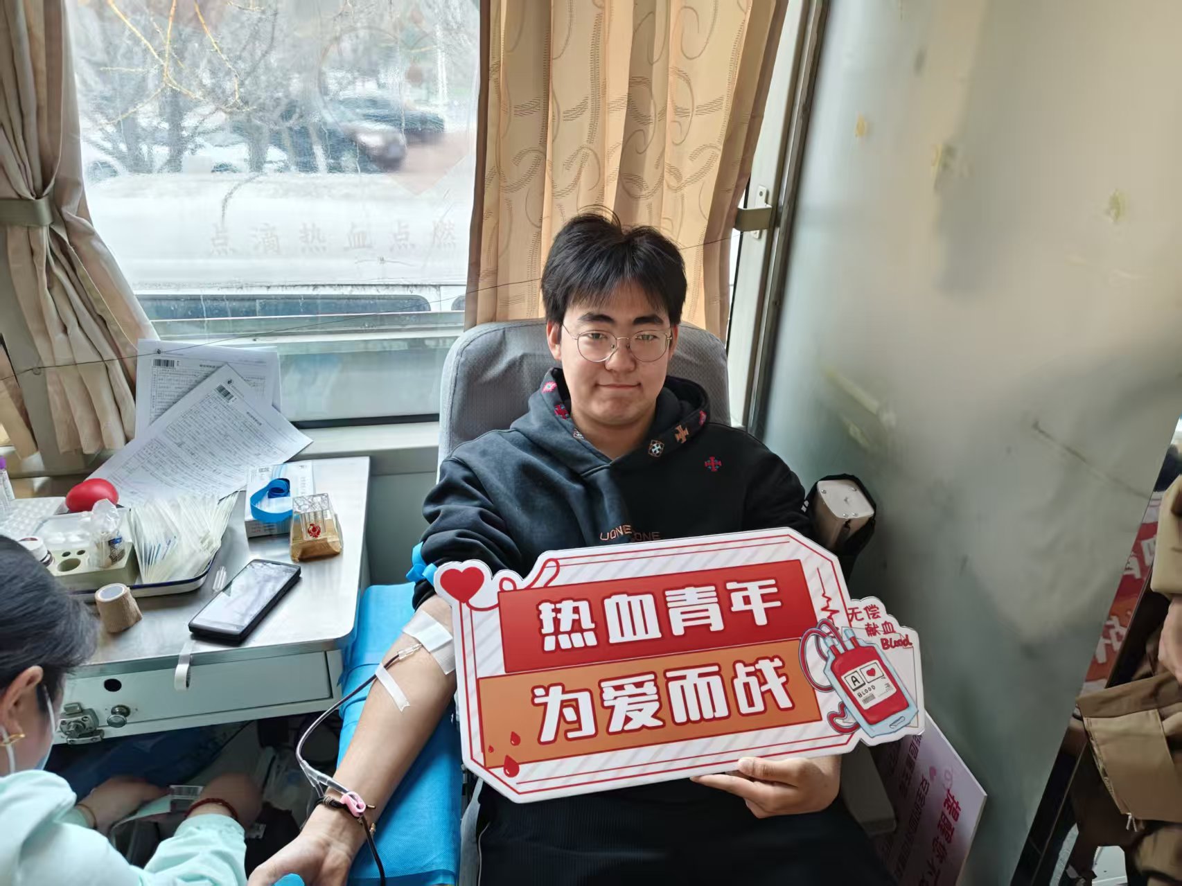 “能帮到急需用血的病人,这是我们年轻人应该做的!”山东理工大学的学生王烽铭笑着说。3月5日,“青春挺膺 爱满山理” 无偿献血活动在山东理工大学举行。活动现场爱心涌动,同学们在医护人员引导下,有序完成登记、血压测量、血液初筛等流程,合格者依次登上献血车,伸出手臂捐献热血,为临床患者送去生命希望,用青春热血践行雷锋精神。当天上午,共有14名学子挺身而出,捐献热血4300毫升,以青春之名续写生命华章,用实际行动诠释新时代青年的社会责任与奉献精神。
