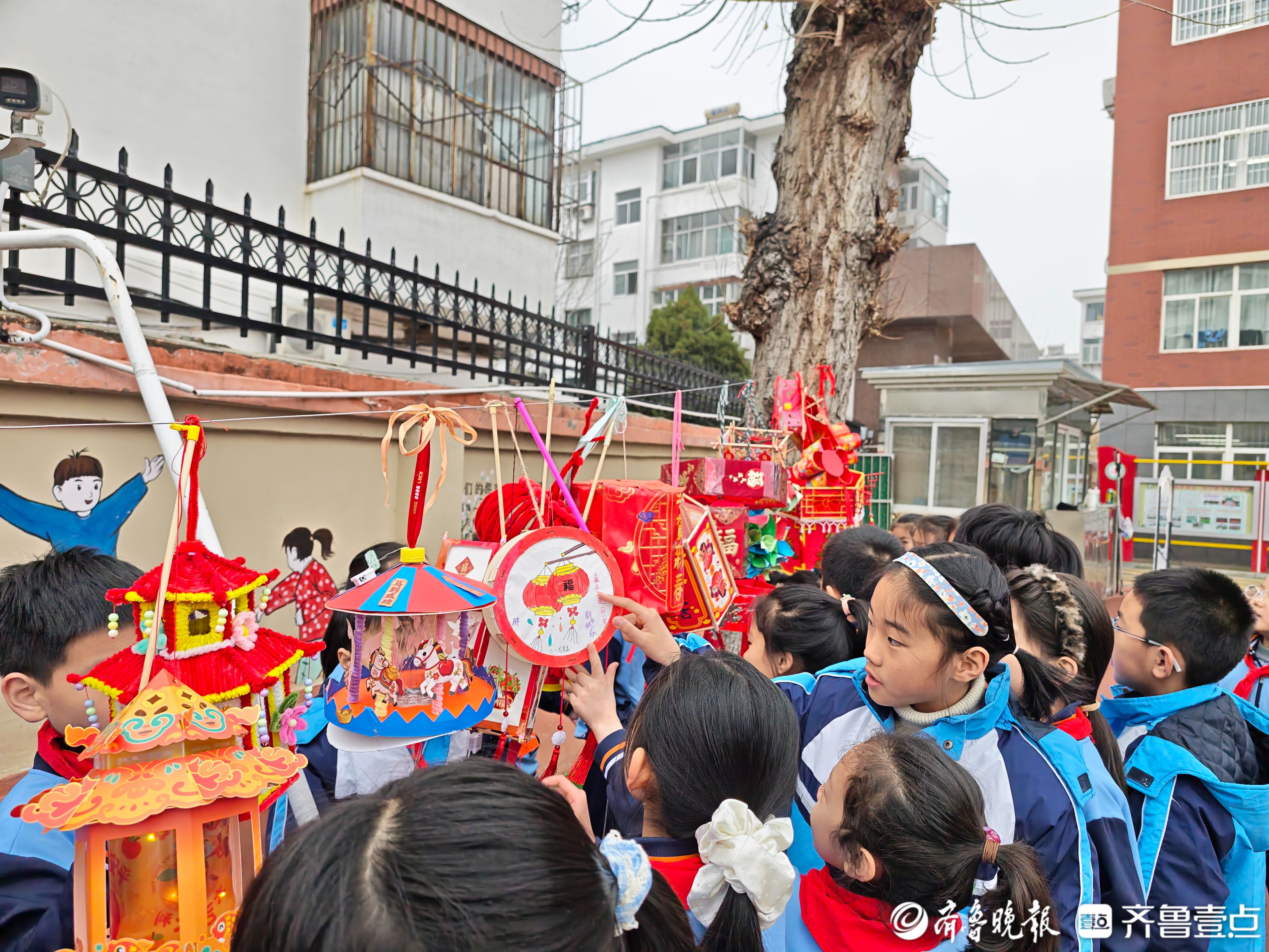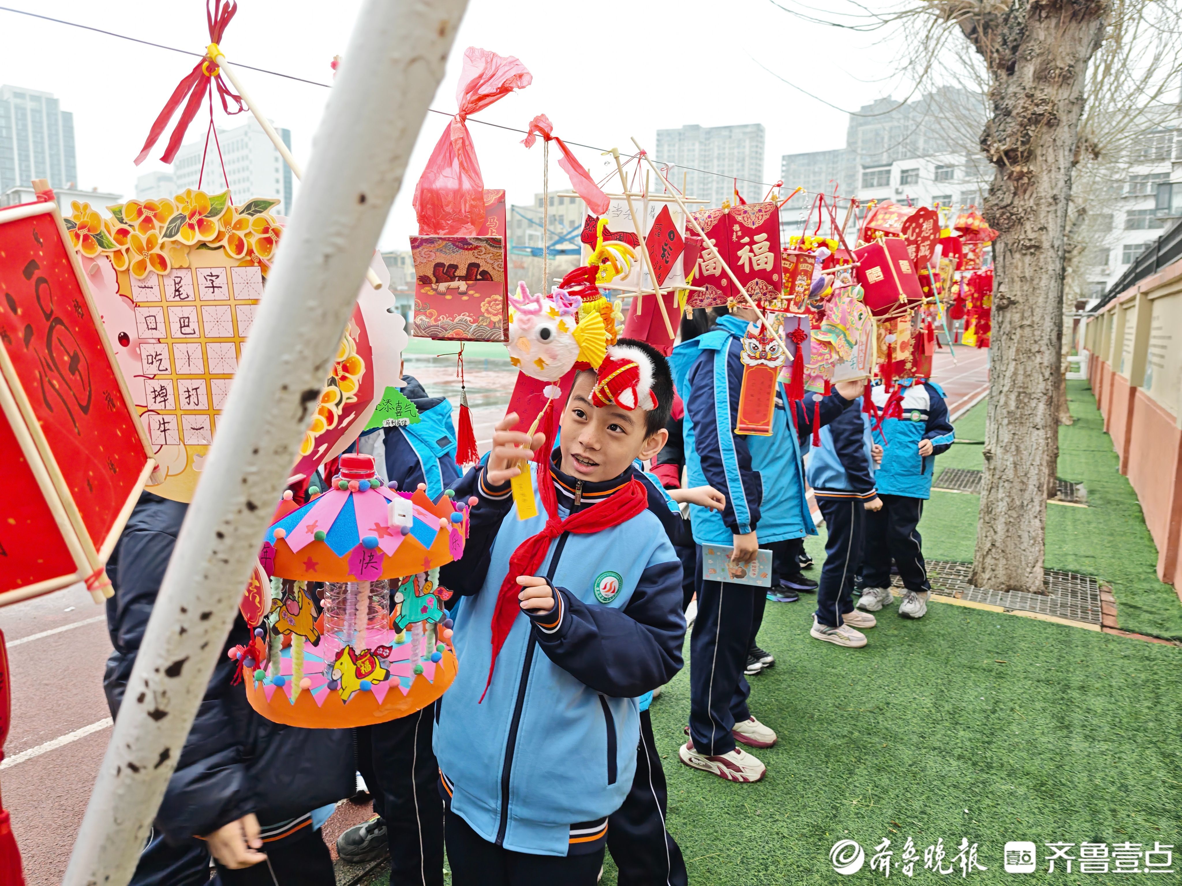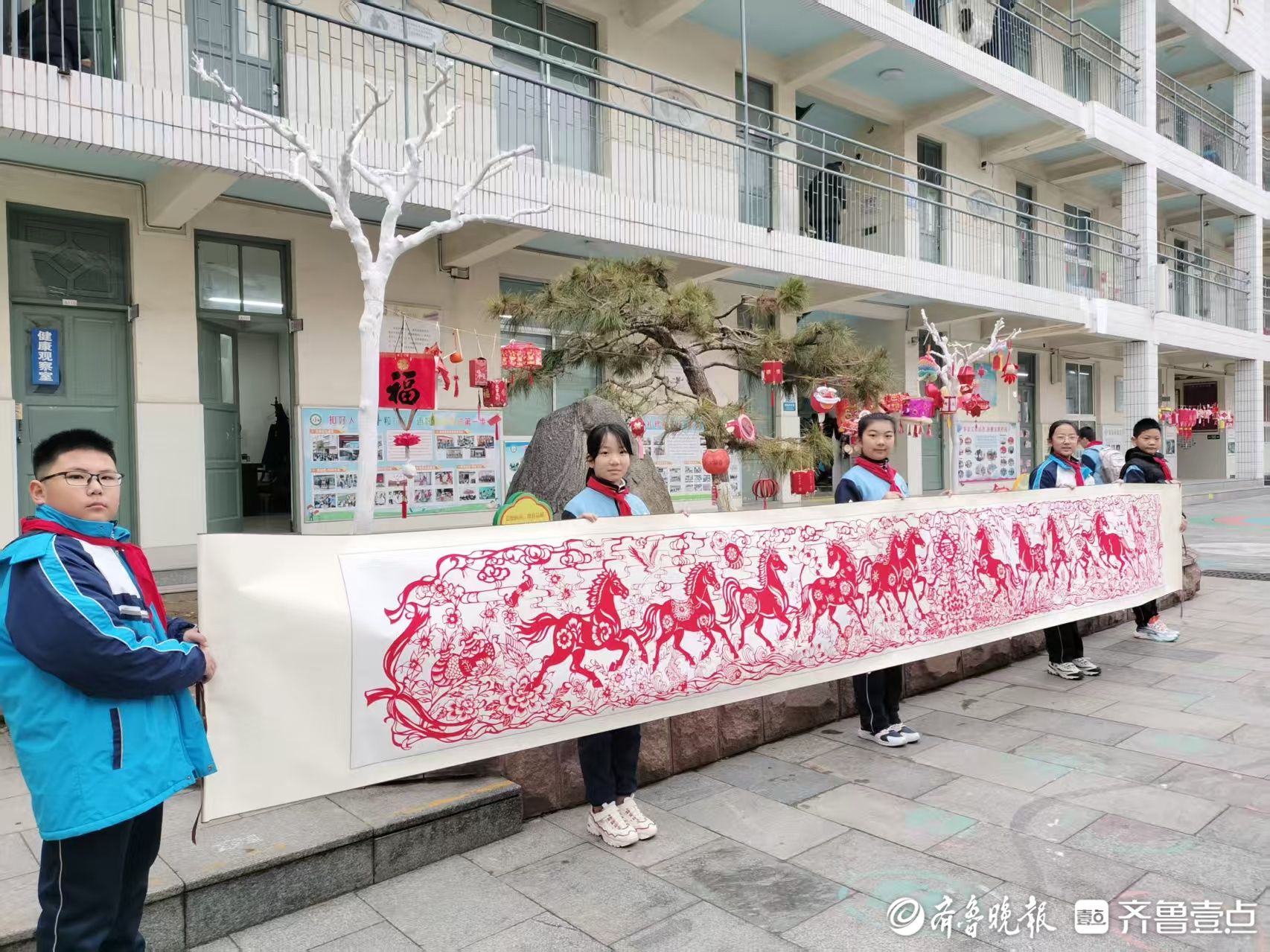 学生手工制作的喜庆灯笼装点枝头,年味与书香相融,将校园映衬得喜庆雅致、生机盎然。骏马剪纸图增添了浓浓文化气息,洋溢着新学期的蓬勃朝气。