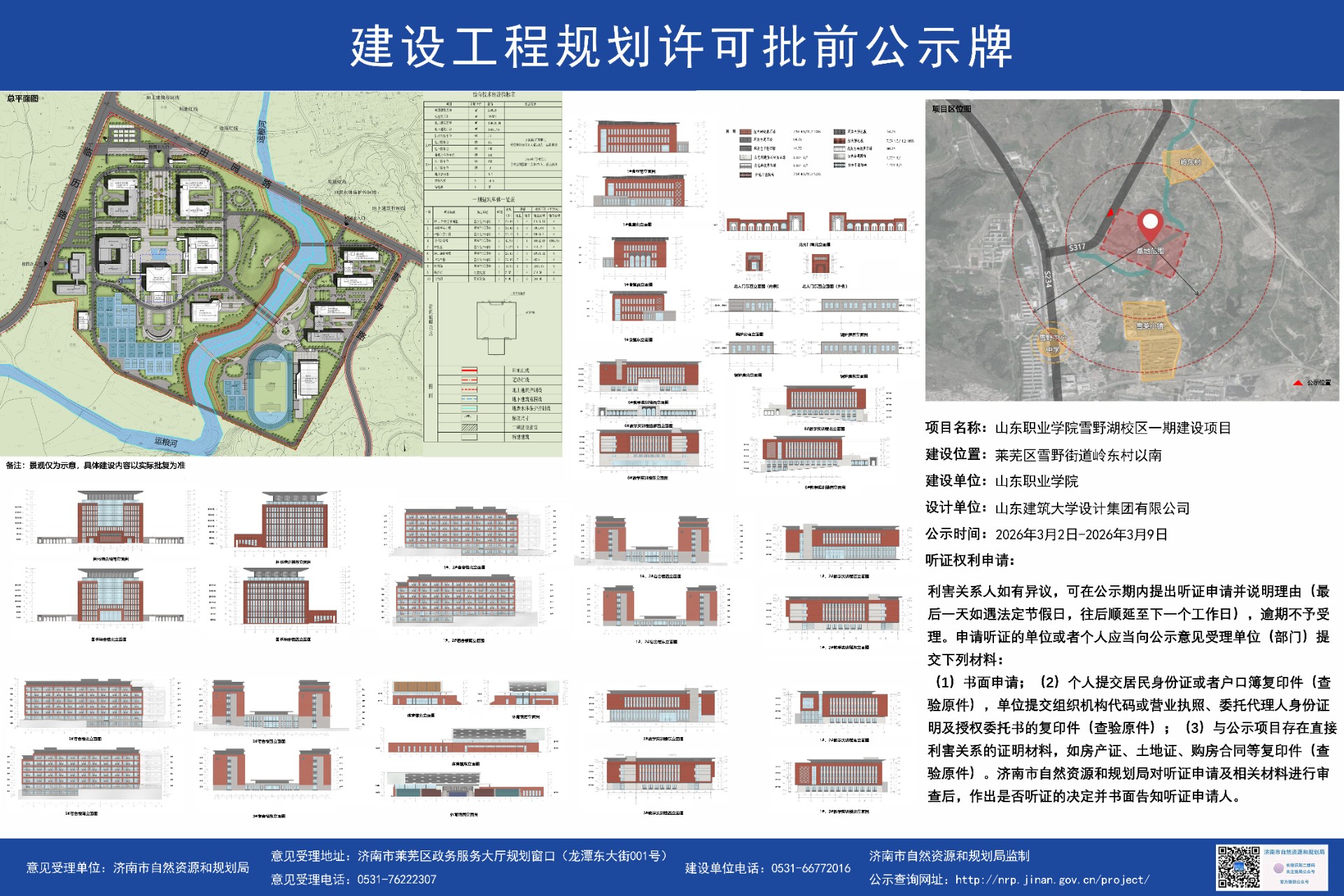 根据公示,山东职业学院雪野湖校区一期项目建设位置在济南市莱芜区雪野街道岭东村以南,项目建设用地达270020平方米,总建筑面积149550平方米,其中地上建筑面积134078.04平方米,地下建筑面积15471.96平方米;配套规划机动车停车位331个,含地上131个、地下200个,非机动车停车位150个,均设置于地上,可满足校园日常通行需求。