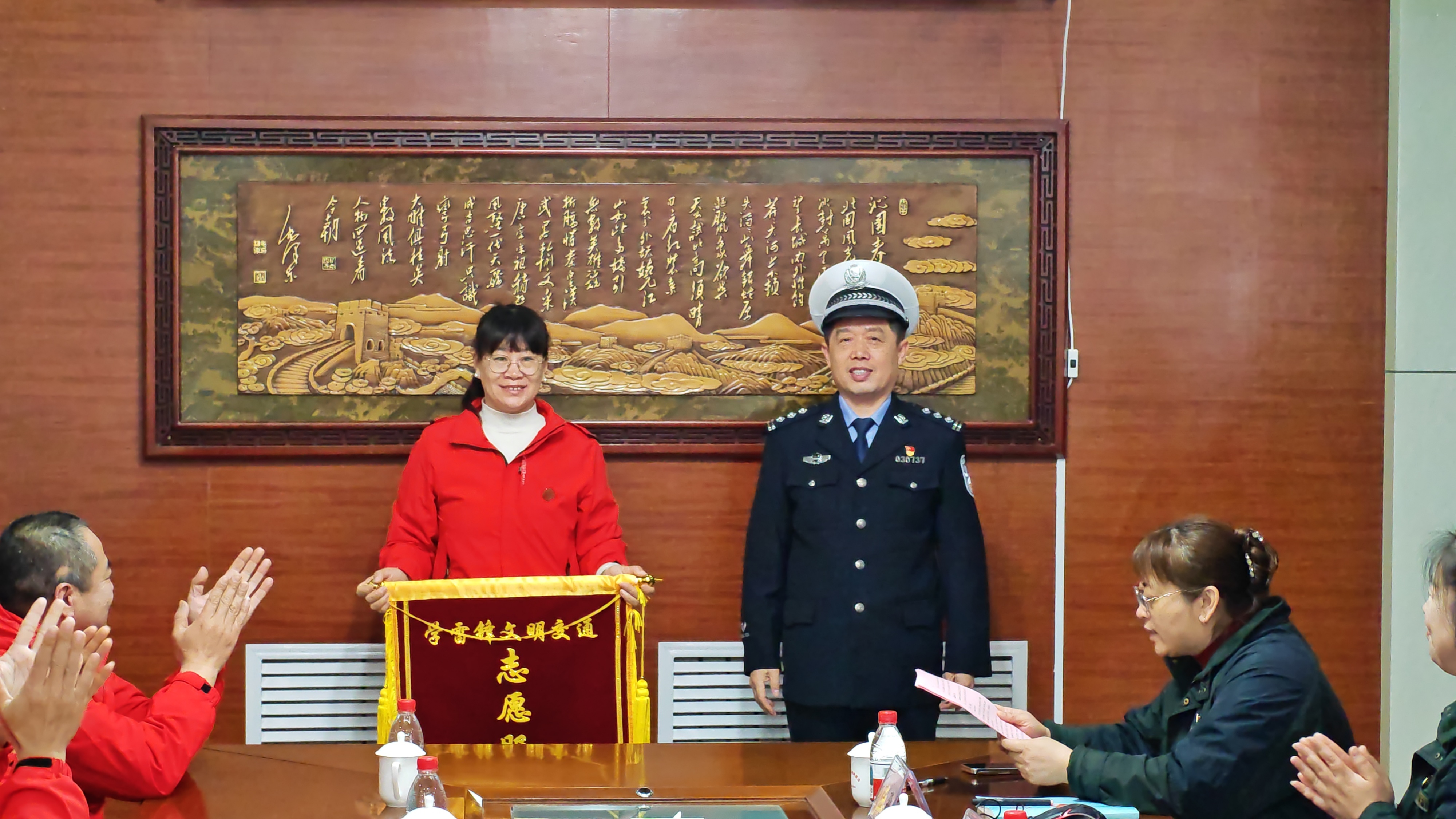 淄博市公安局交通管理支队张店区大队副大队长李强为淄博大众雷锋车队授予“学雷锋文明交通志愿服务队”旗帜,雷锋车队副队长周叶代表车队接旗,她表示:这面旗帜不仅是一份荣誉,更是对车队多年来践行雷锋精神、参与文明交通建设的肯定与鞭策。
