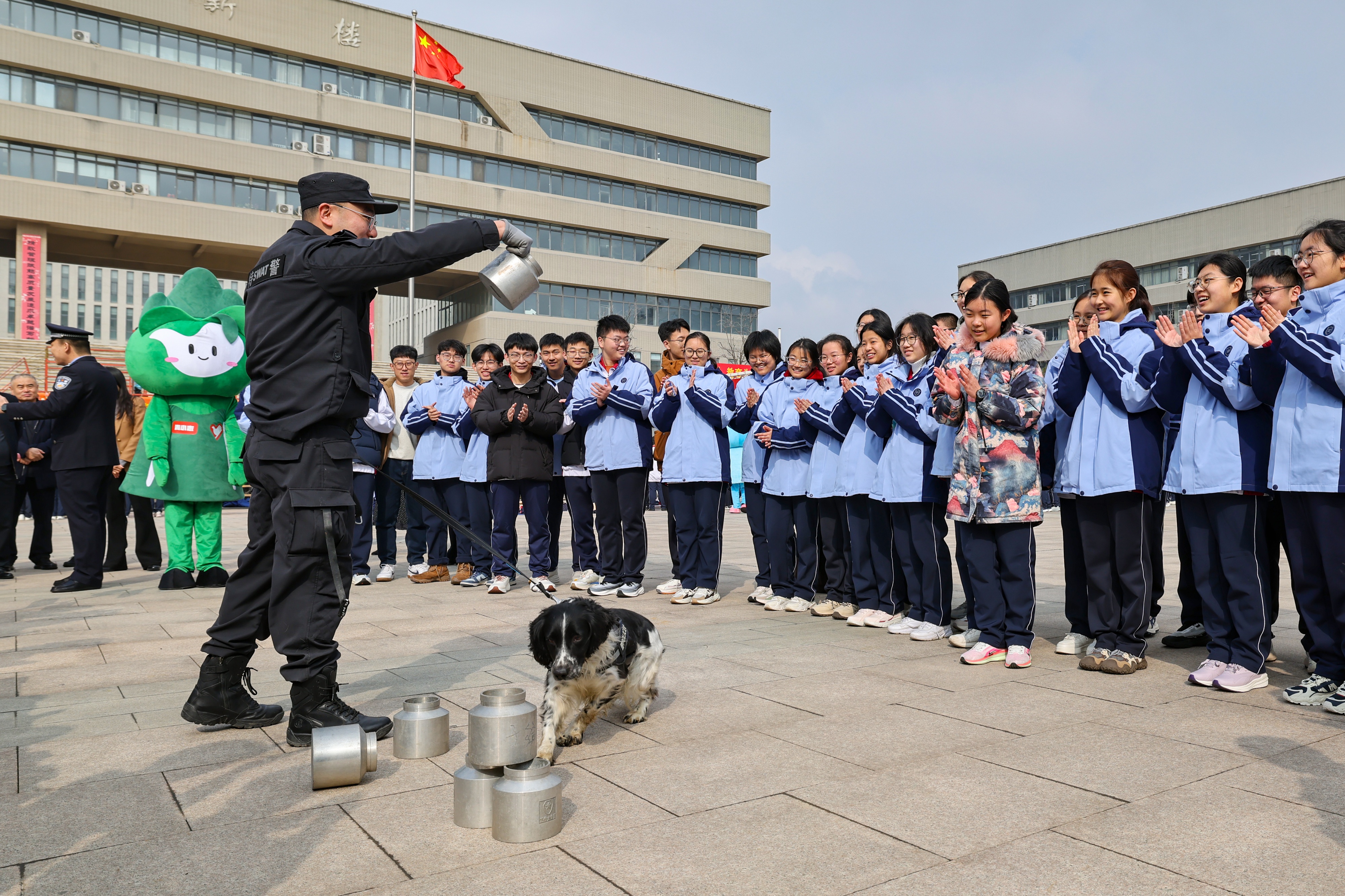 最令学生们热血沸腾的当属“警犬搜排爆展示”和“特警装备体验”。在训导员指挥下,警犬凭借敏锐的嗅觉,迅速从众多行李箱中精准锁定“可疑爆物”,赢得阵阵喝彩。随后,学生们在特警队员的指导下,穿上防暴服、戴上头盔,零距离接触各类高精尖警用装备,并现场学习防身技巧,与特警进行拳击互动体验,现场气氛热烈,掌声与欢呼声此起彼伏,活动区域一度被热情的学生围得“水泄不通”。