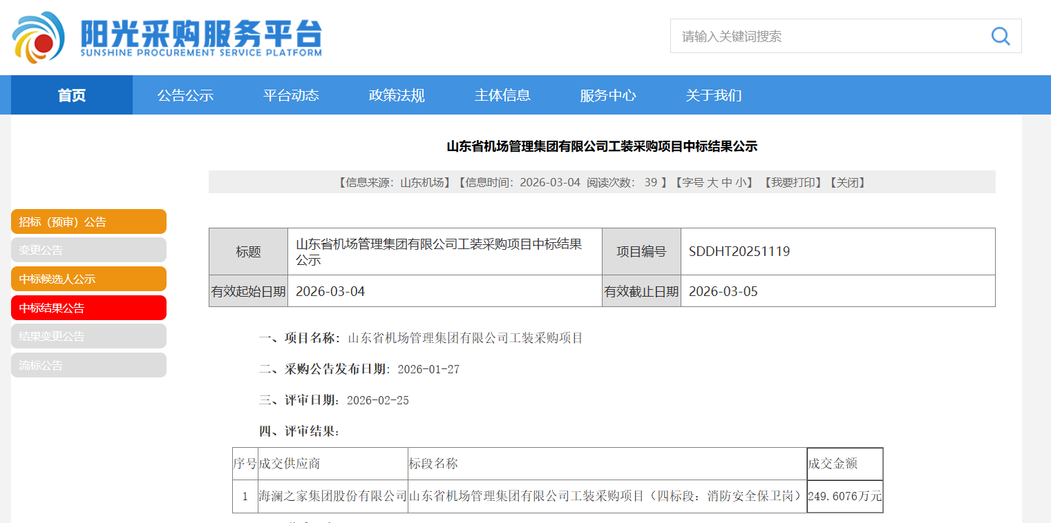 3月4日,阳光采购服务平台公示信息显示,山东省机场管理集团有限公司(以下简称“山东机场集团”)近日完成工装采购项目四标段(消防安全保卫岗)招标工作。海澜之家集团股份有限公司(以下简称“海澜之家”)以249.6076万元中标,较预算金额277.7万元节约28.09万元,节资率10.11%。
