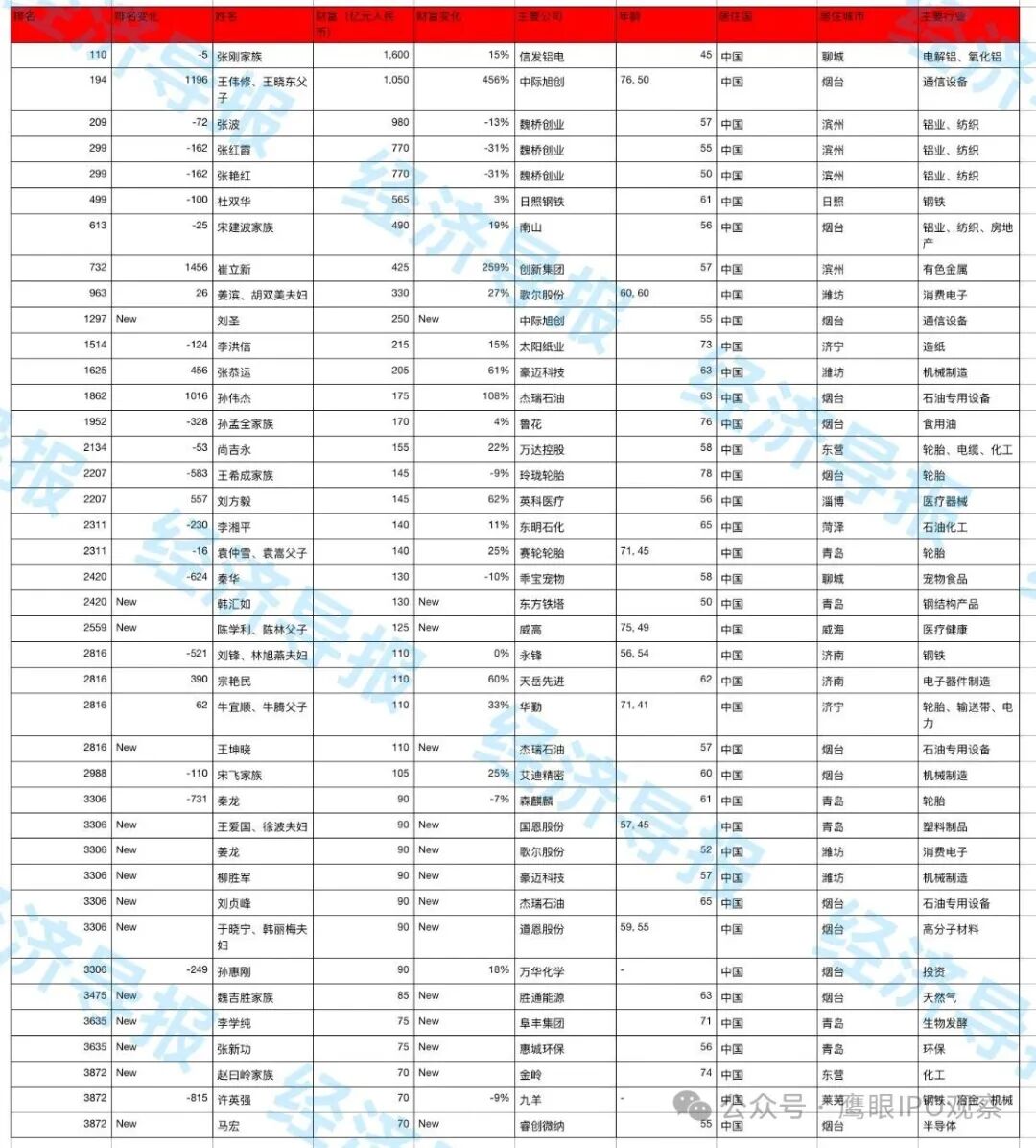 山东40余人上榜胡润全球富豪榜,信发张刚家族居首,中际旭创财富暴涨