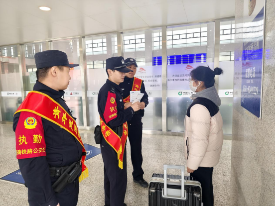 青年民警聚焦大客流动向,在车站进出站口、安检处、候车室等重点区域、重点部位游动巡视,主动为旅客提供购票指引、换乘咨询等便民服务。