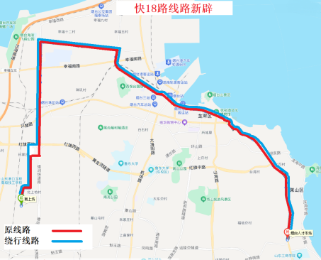 由南上坊发车,沿楚玉路、芝纬北三街、红旗西路(绕行时)、化工路、幸福中路、幸福路、芝罘屯路、北马路、大马路、二马路、观海路运行至烟台人才市场。