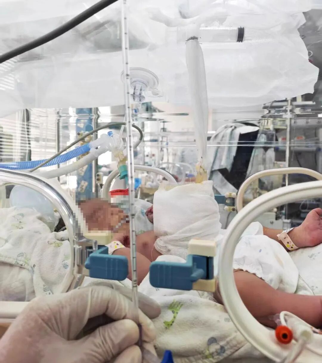 术后宝宝送入NICU,24小时监护:监测腹内压、抗感染、营养支持、呼吸管理……医护人员日夜守护,等待腹腔慢慢长大。