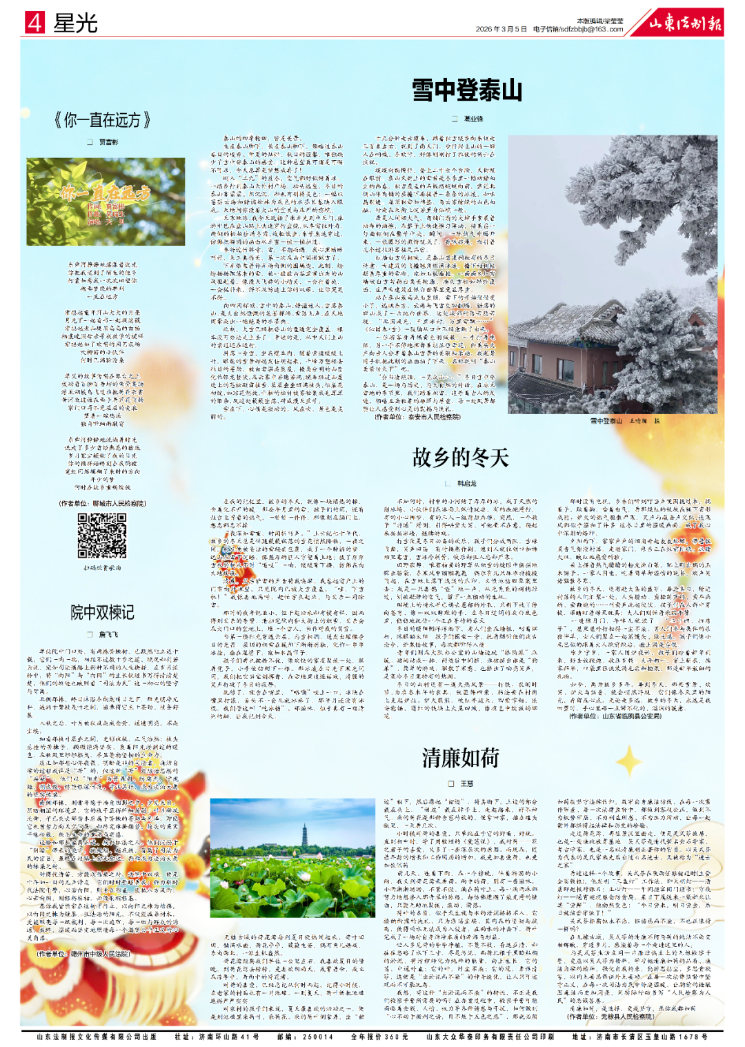 以文载道,以笔铸魂。为丰富法治文化内涵,展现政法队伍的人文风采,《山东法制报》副刊现面向全省政法系统干警、职工及文学爱好者长期征集文学作品。我们期待用文字记录法治进程中的点滴故事,用笔墨抒写政法人的情怀与担当。