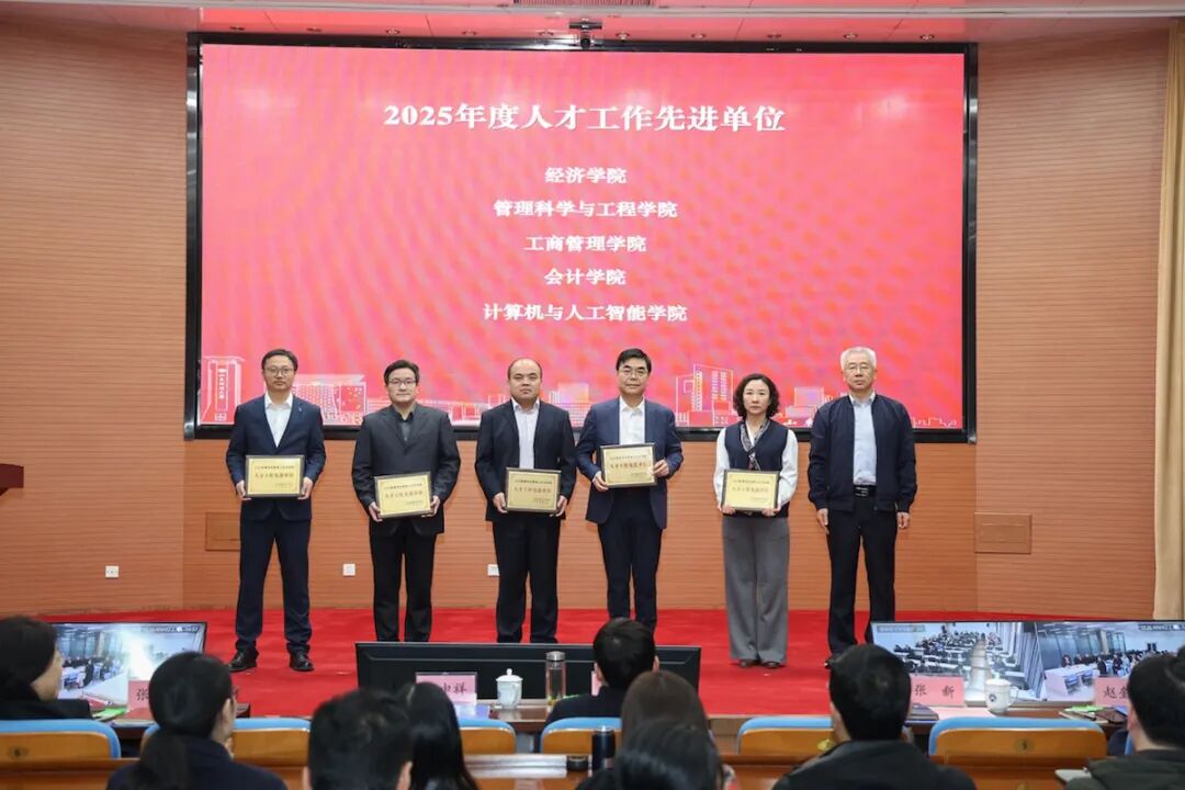副校长张新为人才工作先进单位经济学院、管理科学与工程学院、工商管理学院、会计学院、计算机与人工智能学院代表颁奖。