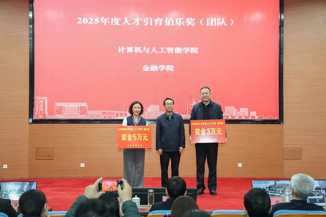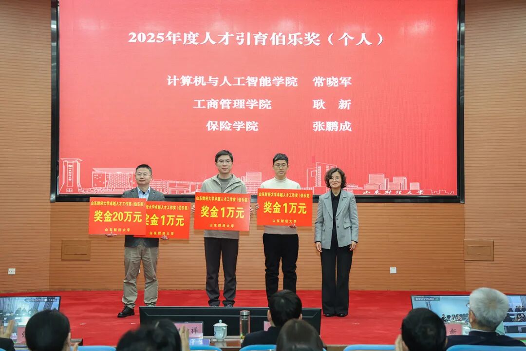 纪委书记、监察专员王玉花为计算机与人工智能学院常晓军、工商管理学院耿新、保险学院张鹏颁发人才引育伯乐奖。