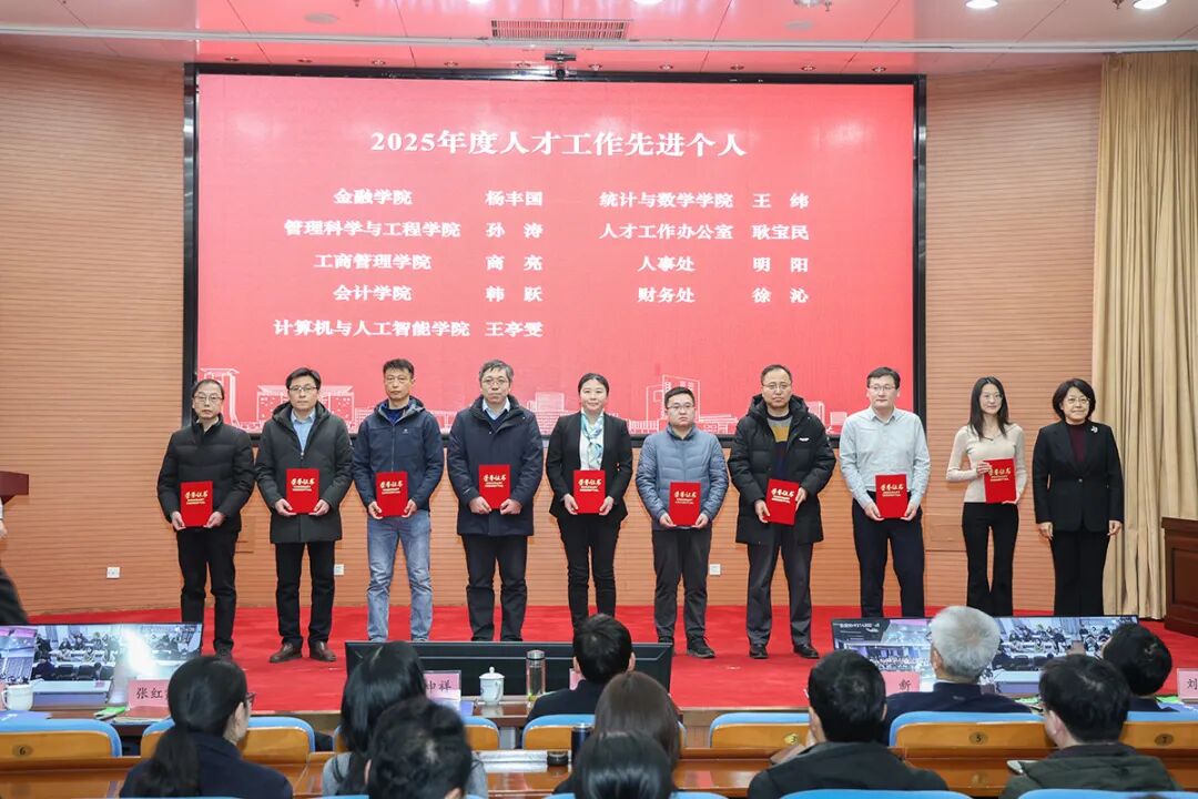 副校长张红霞颁发人才工作先进个人奖。金融学院杨丰国、管理科学与工程学院孙涛、工商管理学院商亮、会计学院韩跃、计算机与人工智能学院王亭雯、统计与数学学院王纬、人才工作办公室耿宝民、人事处明阳、财务处徐沁上台领奖。