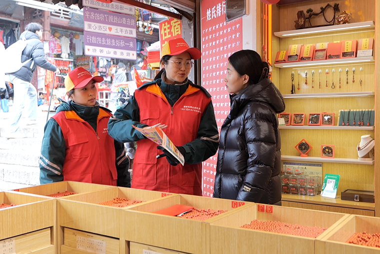 在泰山红门景区,志愿者们与景区管委工作人员一同向商户普及室内用电安全、电力设施保护及触电急救知识,政企联动、形成合力。同时,将电力服务与生态保护相融合,仔细核查线路与古树树干的安全距离、设备运行状态,对周边电力设施进行全面“体检”。志愿者们还来到大汶河湿地沿岸,开展拉网式垃圾清理,并宣讲生态保护知识,守护湿地生态安全。