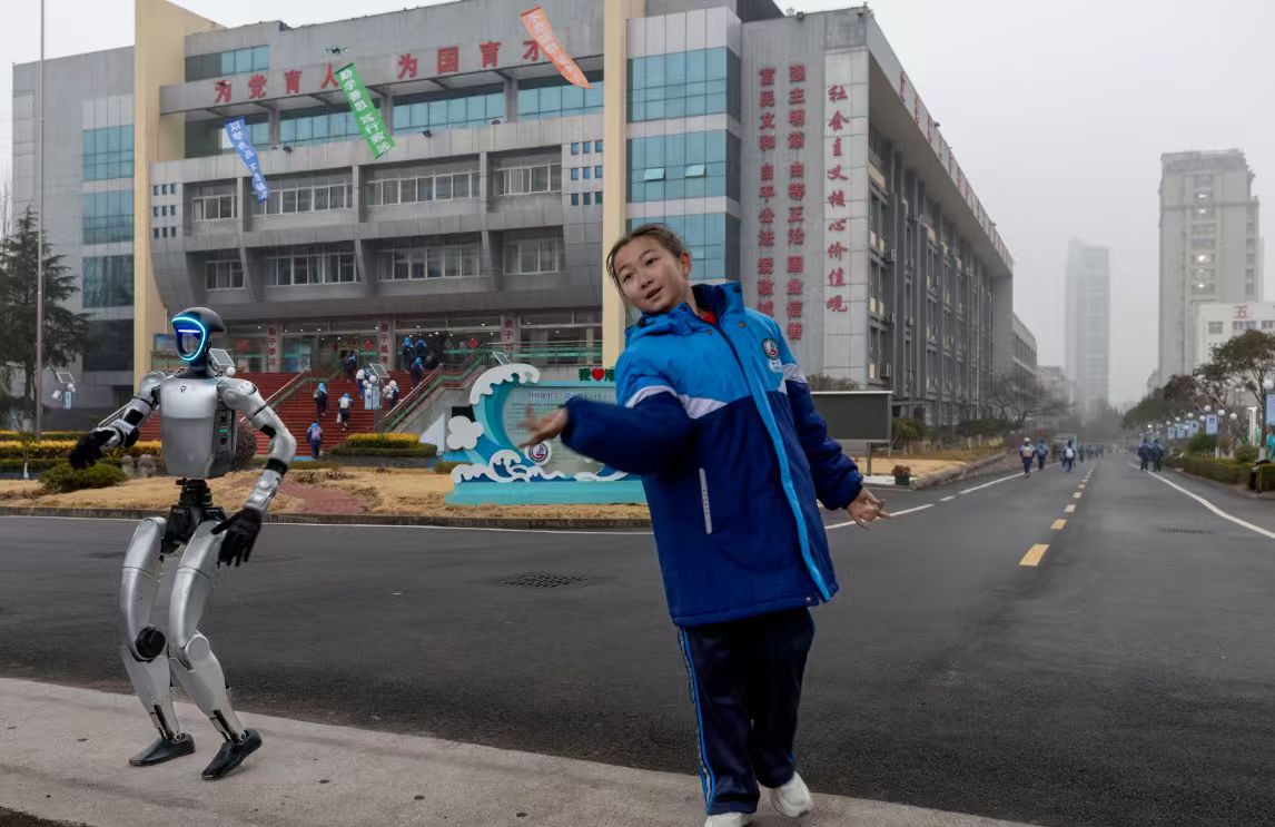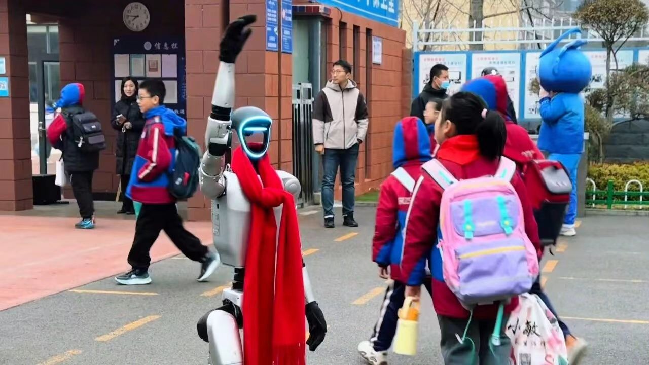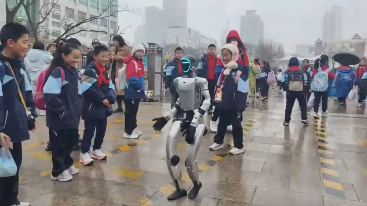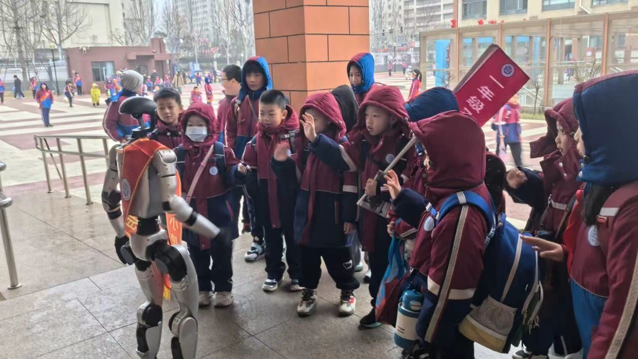在日照港中学校门口,一台春晚同款机器人与机器狗组成“迎接小队”,随着校园广播的旋律,精准完成武术招式、轻快舞步等一系列动作,灵活的肢体控制、流畅的动作衔接,瞬间吸引了返校学生的目光。现场还有学生主动上前,与机器人展开即兴“斗舞”,引得周围师生纷纷驻足喝彩。随后,机器人走进教室,和同学们交流互动,让孩子们在互动中解锁科技知识,缓解了开学的紧张情绪。