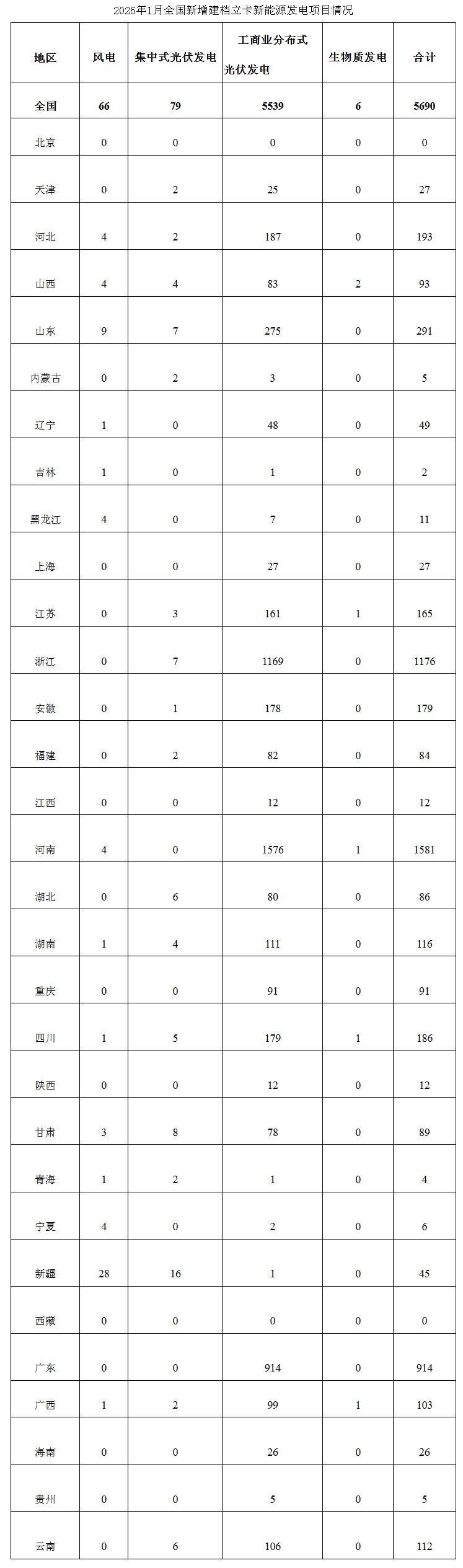 2026年1月,全国新增建档立卡新能源发电(不含户用光伏)项目共5690个,其中风电项目66个,光伏发电项目5618个(集中式光伏发电项目79个,工商业分布式光伏发电项目5539个),生物质发电项目6个。风电、集中式光伏发电、生物质发电项目清单见附件,工商业分布式光伏发电项目清单详见国家可再生能源发电项目信息管理平台网站(网址https://jdlk.renewable.org.cn/card-info-sheet/)。
