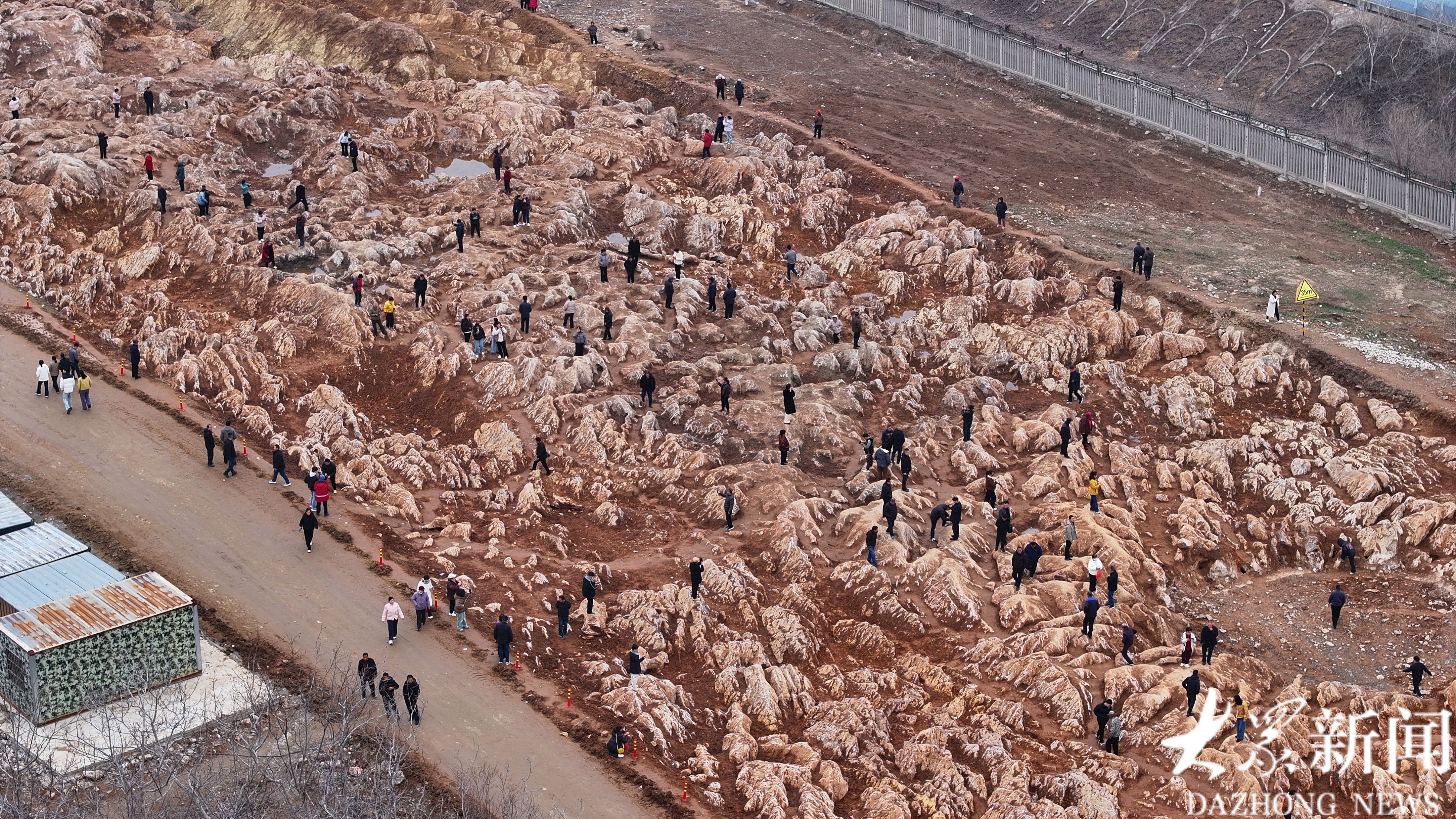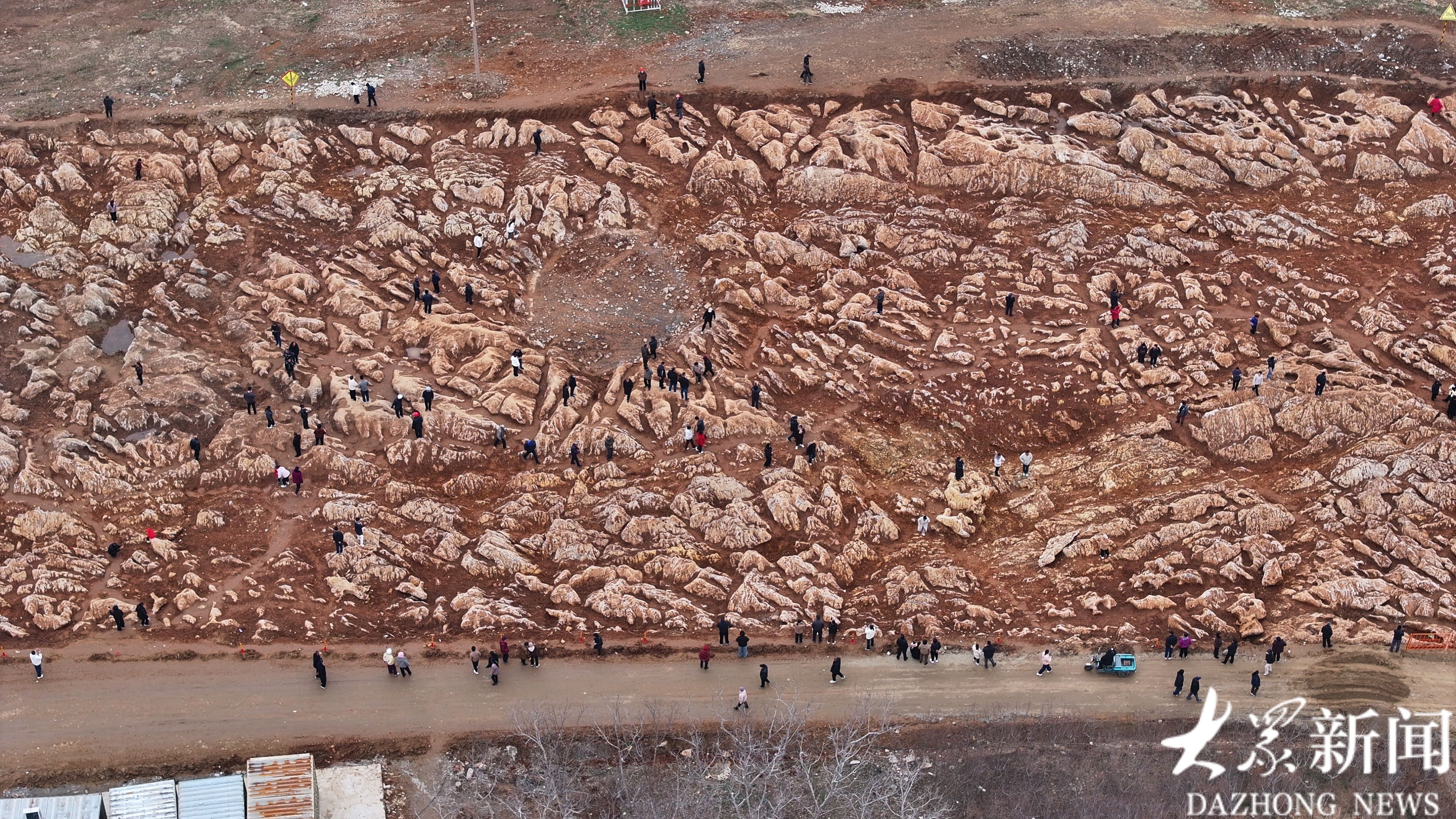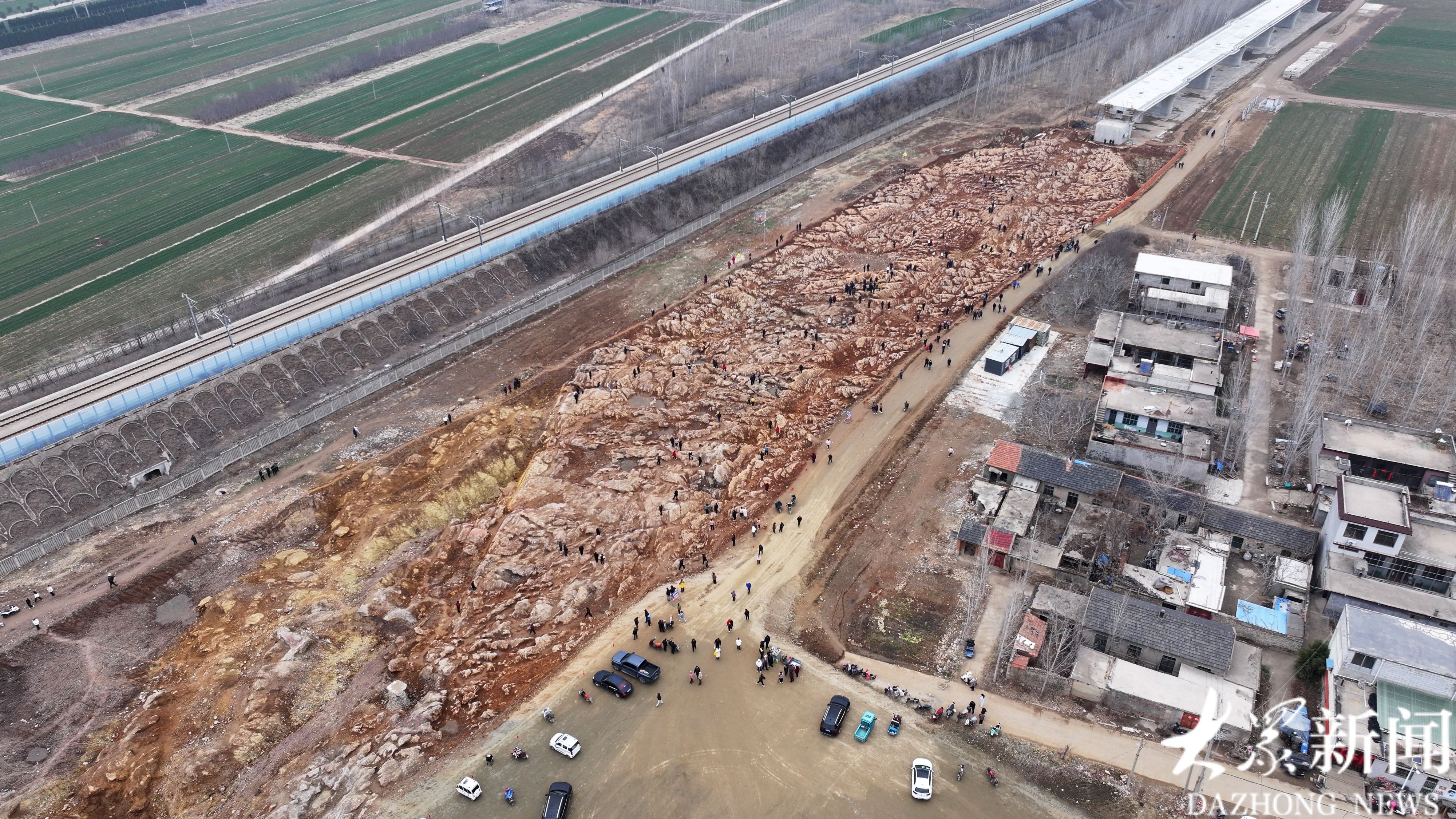 这片“石海”地处宁阳县磁窑镇东磨庄村东、华丰镇歇息铺村西的大型施工场地内。施工现场南北长约300米、东西宽近100米,西侧紧邻在建高铁线路,东侧不远处就是村民住宅,独特的地质景观与高铁建设工地、村落民居相邻,形成了特别的画面。