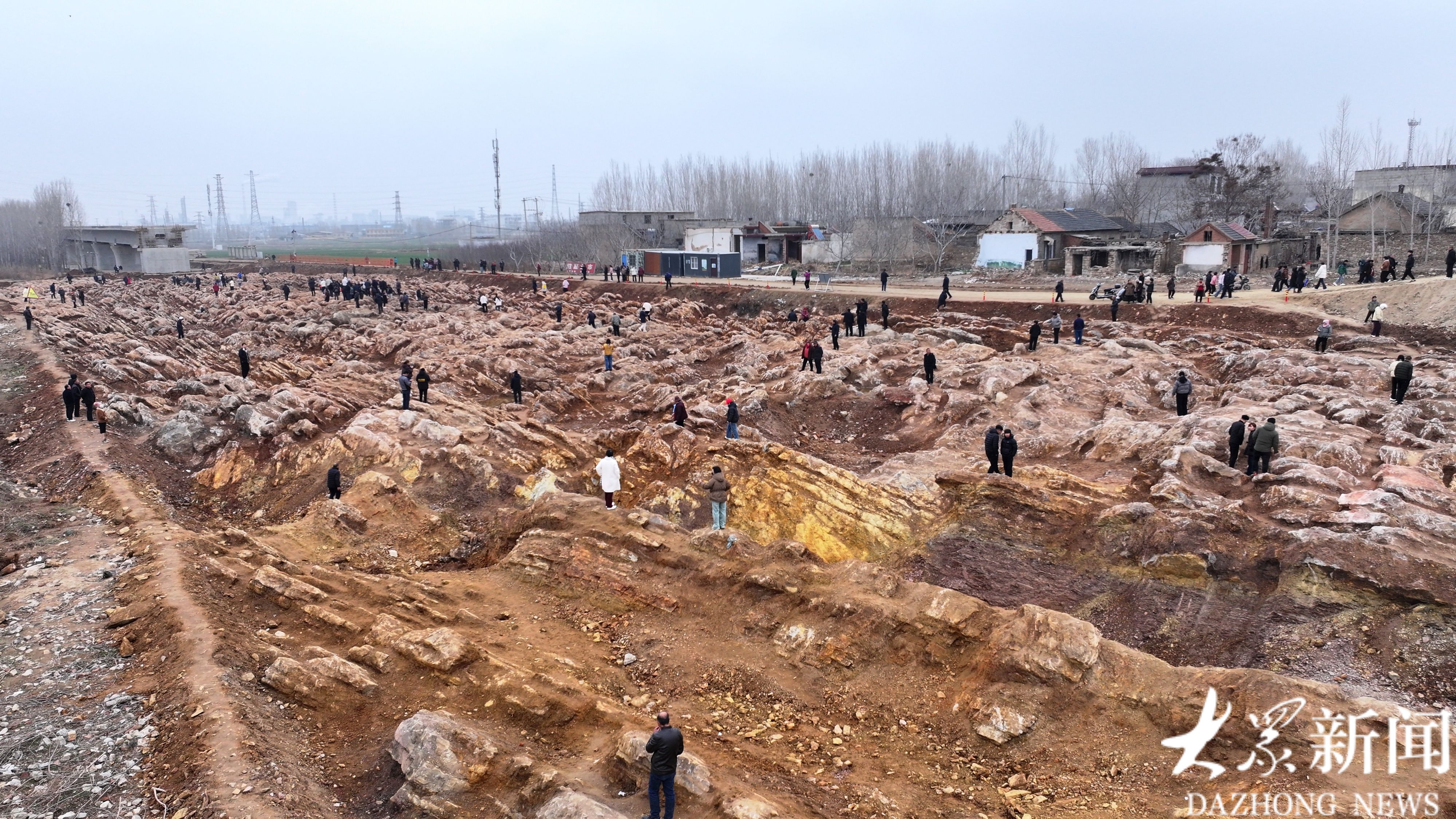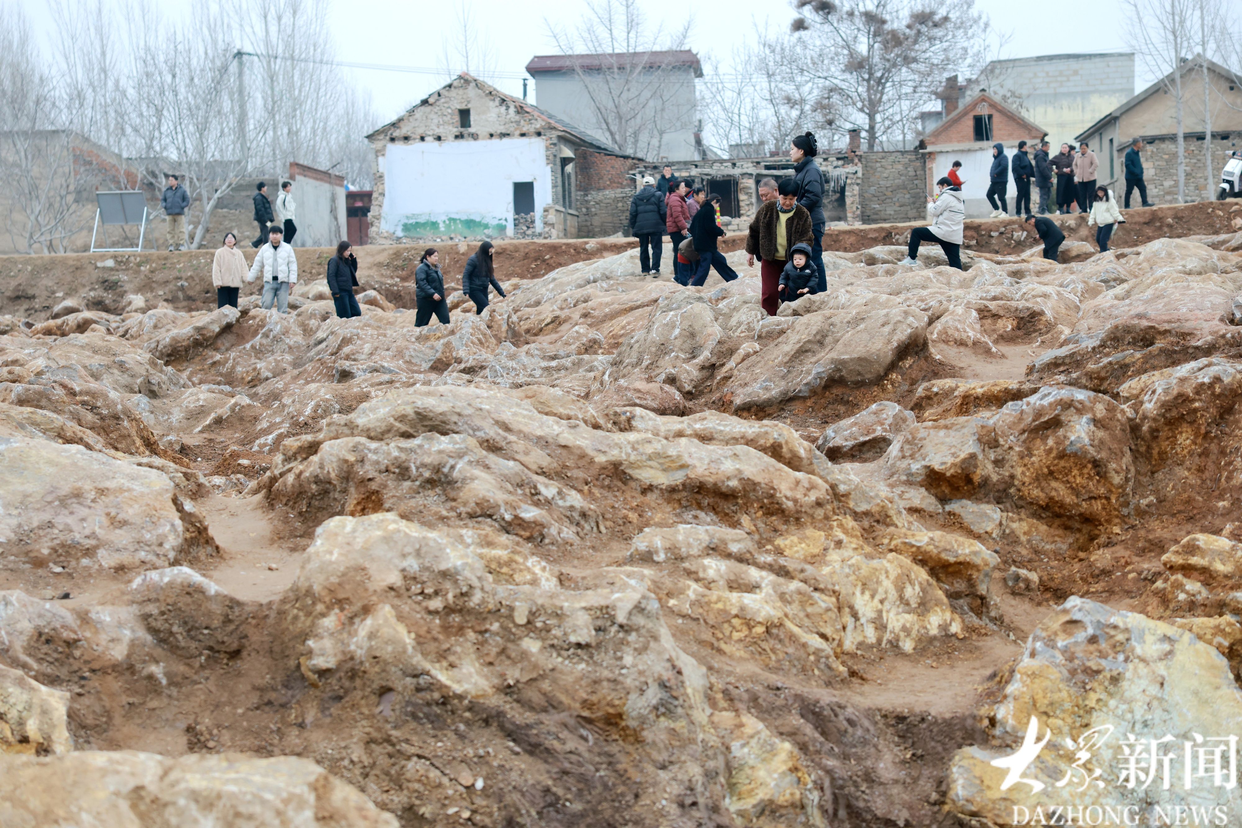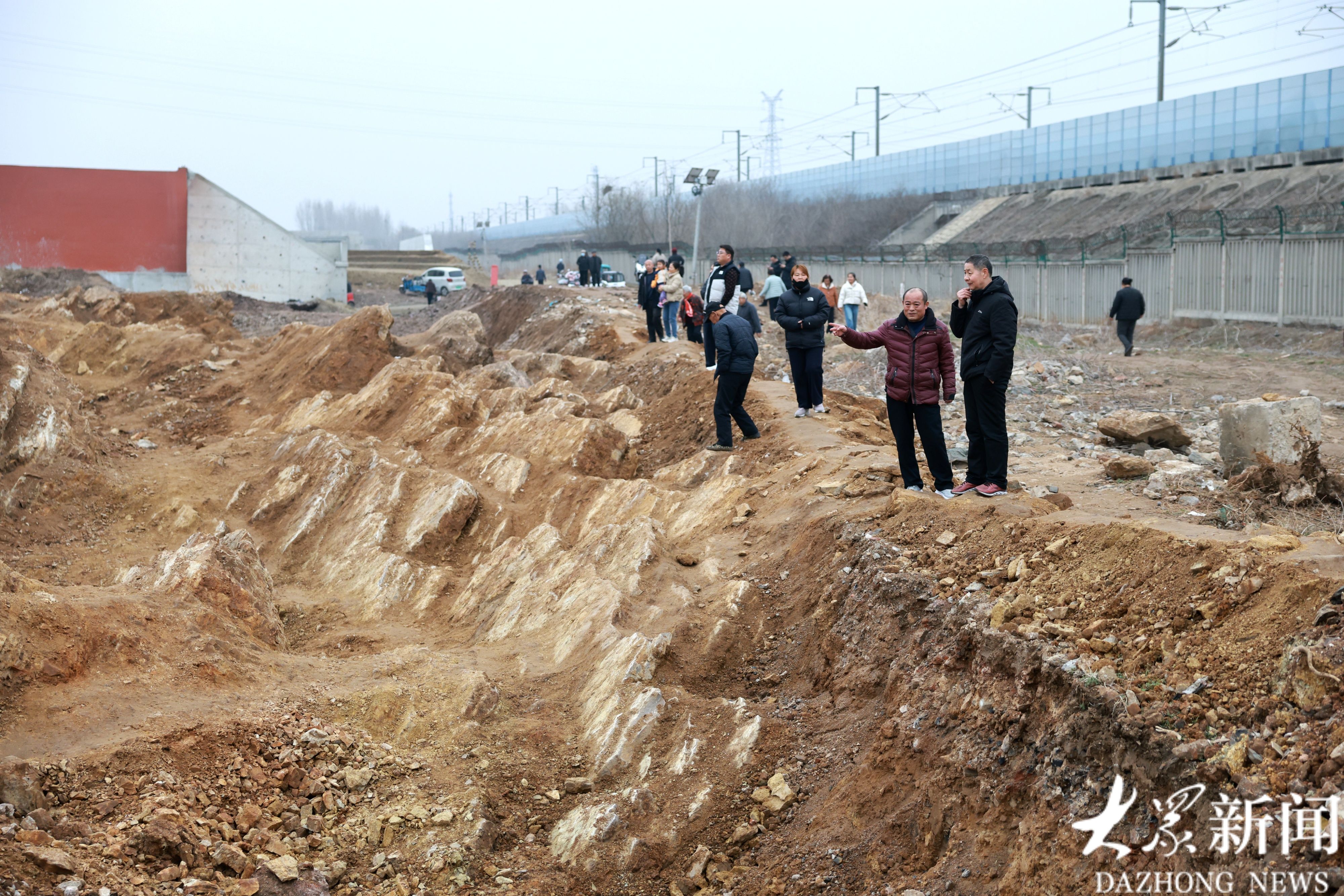 这片“石海”地处宁阳县磁窑镇东磨庄村东、华丰镇歇息铺村西的大型施工场地内。施工现场南北长约300米、东西宽近100米,西侧紧邻在建高铁线路,东侧不远处就是村民住宅,独特的地质景观与高铁建设工地、村落民居相邻,形成了特别的画面。