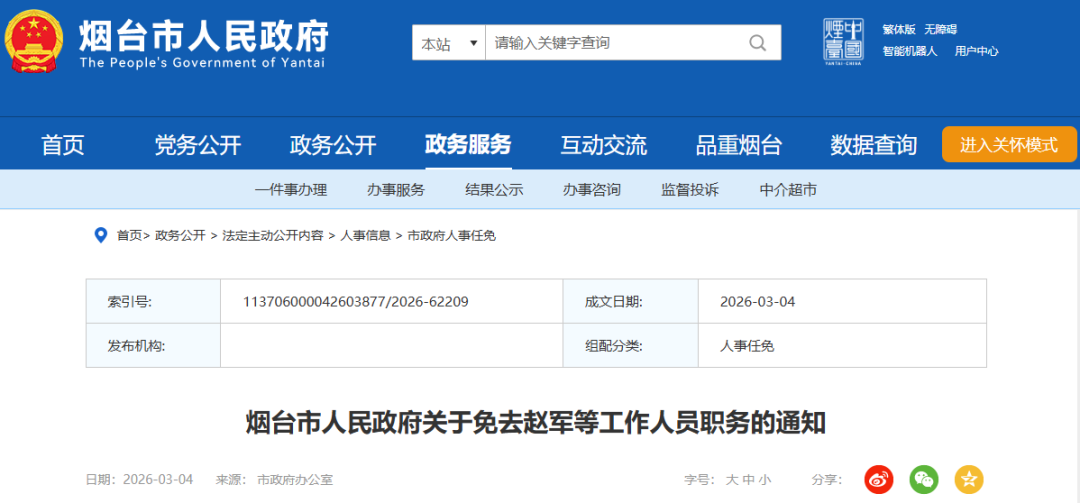烟台市人民政府关于免去赵军等工作人员职务的通知烟政任〔2026〕2号各区市人民政府(管委),市政府各部门,各单位:经研究决定,免去:赵军的烟台艺术学校校长职务;李兴佐的烟台农业学校校长职务。烟台市人民政府2026年2月25日