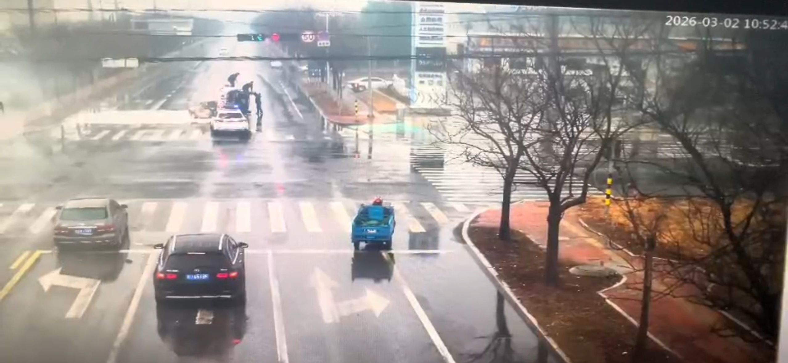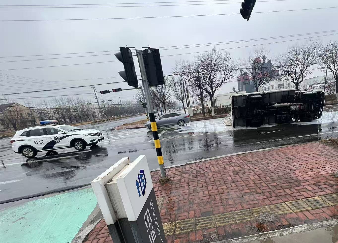 2026年3月2日10时50分许,孙受派出所辅警赵力兴驾驶警车途经莱西市龙口西路与深圳南路路口时,突然发现前方一辆白色货车在拐弯时,因雨天路滑、加之货物惯性作用发生侧翻。车上装载的白色液体大面积泄漏,驾驶员被困车内。