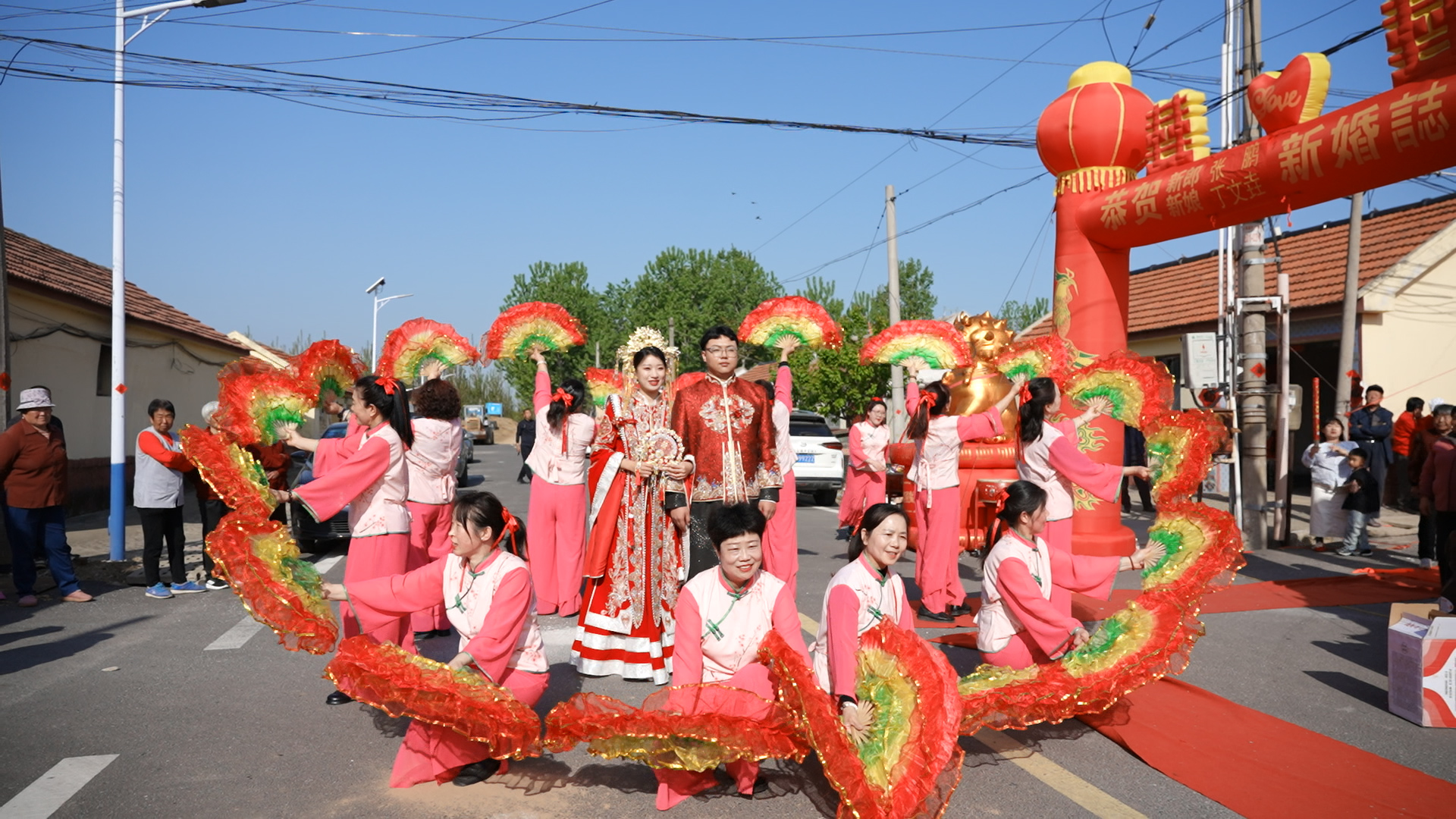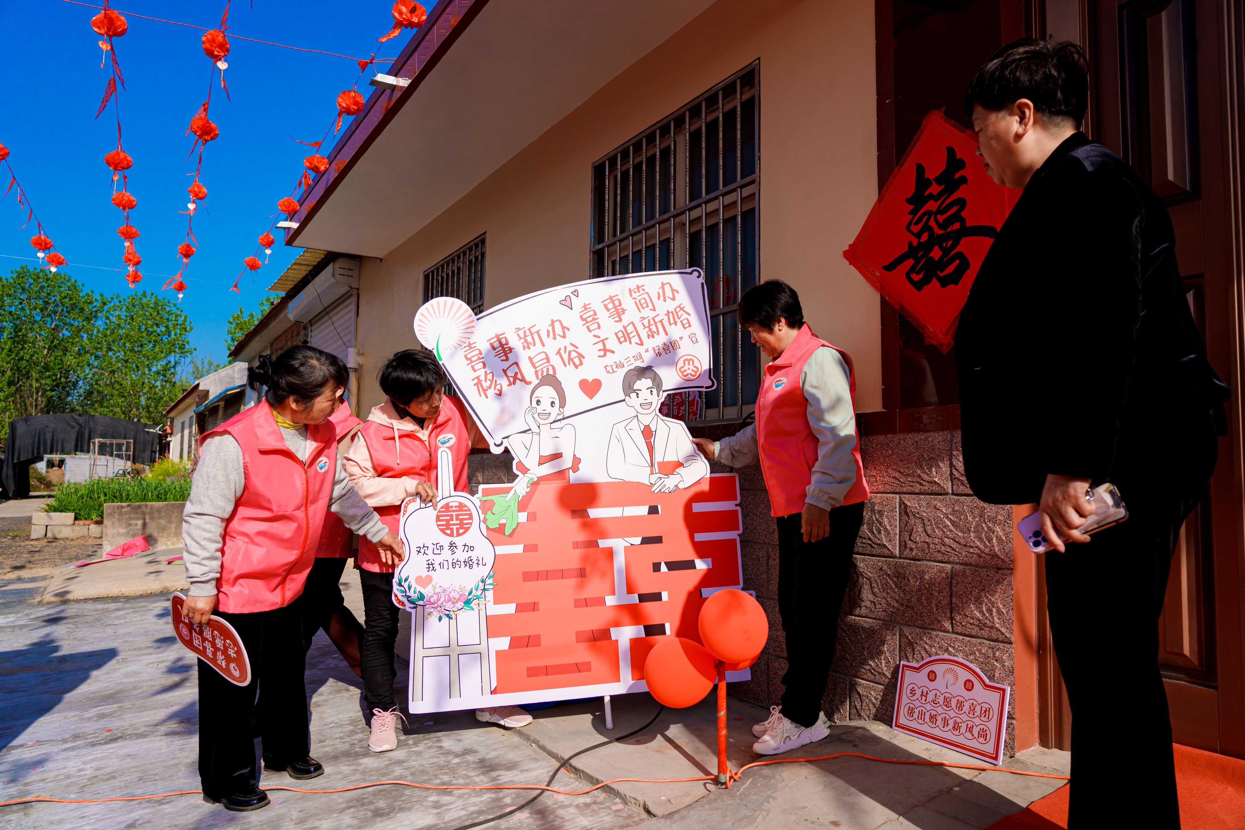 老纪的儿子婚礼当天,没有震天响的鞭炮,没有铺张浪费的酒席,但锣鼓声、欢笑声一样不少。毕纪花带着“帮喜团”的队员们敲着锣鼓、扭着秧歌,把新娘子热热闹闹迎进了门。婚礼现场布置得简单而温馨,处处点缀着队员们亲手剪的红色囍字,桌上还有炸的“油果子”。